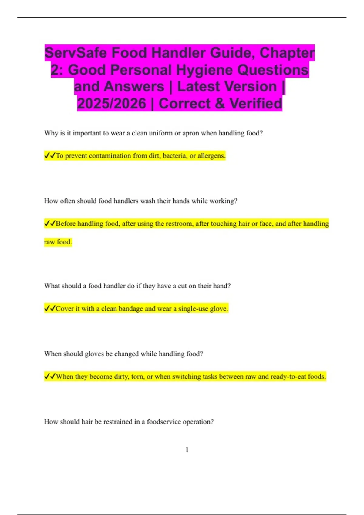 ServSafe Food Handler Guide, Chapter 2: Good Personal Hygiene Questions and Answers | Latest Version | 2025/2026 | Correct & Verified Why is it important to wear a clean uniform or apron when handling food? To prevent contamination from dirt, bacteria, or allergens. How often should food handlers wash their hands while working? Before handling food, after using the restroom, after touching hair or face, and after handling raw food. What should a food handler do if they have a cut on their hand? Cover it with a clean bandage and wear a single-use glove. When should gloves be changed while handling food? When they become dirty, torn, or when switching tasks between raw and ready-to-eat foods. How should hair be restrained in a foodservice operation? 2 Use a hat, hairnet, or other hair restraint. What is the safest way for a food handler to sneeze or cough? Into a tissue or elbow, then wash hands immediately. Why should food handlers avoid wearing jewelry while preparing food? It can harbor bacteria and may fall into food, causing contamination. What should a food handler do after handling raw meat? Wash hands thoroughly before touching any other food or equipment. Why is personal hygiene important in food handling? To prevent the transfer of pathogens that can cause foodborne illness. What is the correct way to wash hands? Wet hands with warm water, apply soap, scrub for at least 20 seconds, rinse, and dry with a clean towel. 3 When is it acceptable for a food handler to work while sick? It is never acceptable if experiencing vomiting, diarrhea, jaundice, or a diagnosed foodborne illness. How should fingernail polish and fake nails be managed in a foodservice environment? Avoid them unless wearing gloves at all times. What is the proper way to store personal items in a kitchen? In a designated area away from food, food-contact surfaces, and utensils. Why should a food handler report illnesses to their manager? To prevent spreading foodborne illness to customers. What should a food handler do if they have symptoms of vomiting or diarrhea? Stay home or be excluded from work until symptom-free for at least 24 hours. Why is bare-hand contact with ready-to-eat food discouraged? It increases the risk of transferring pathogens to food. 4 How should a food handler handle sneezing in a food prep area? Leave the area if possible, cover sneeze