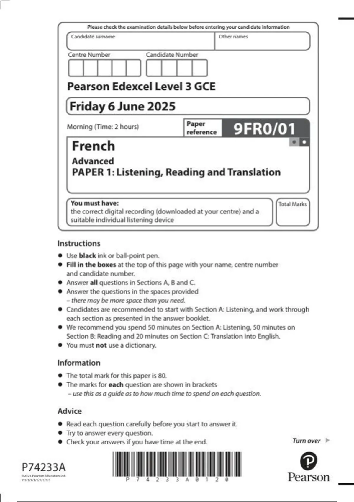 Pearson Edexcel Level 3 GCE French Paper reference 9FR0/01 Advanced PAPER 1: Listening, Reading and Translation june 2025