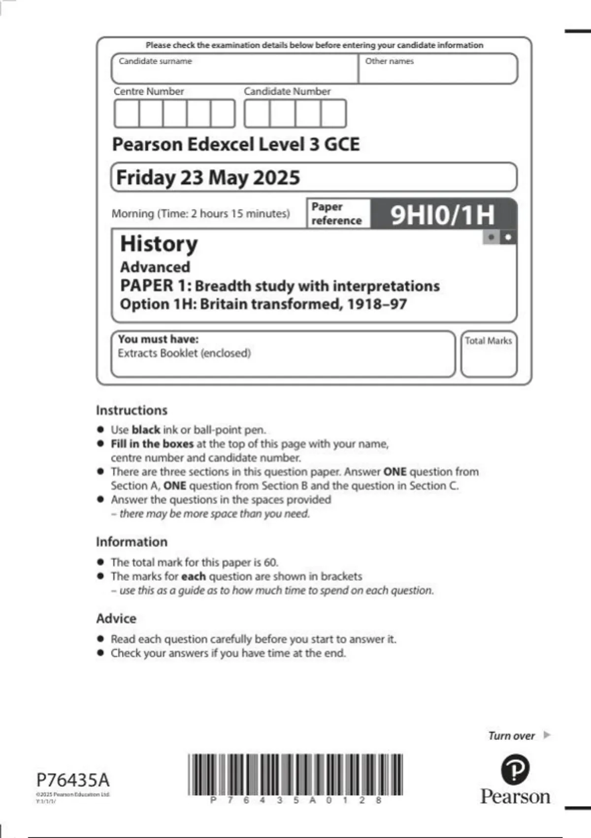 Pearson Edexcel Level 3 GCE 9HI0/1H History Advanced PAPER 1: Breadth study with interpretations Option 1H: Britain transformed, 1918-97 June 2025