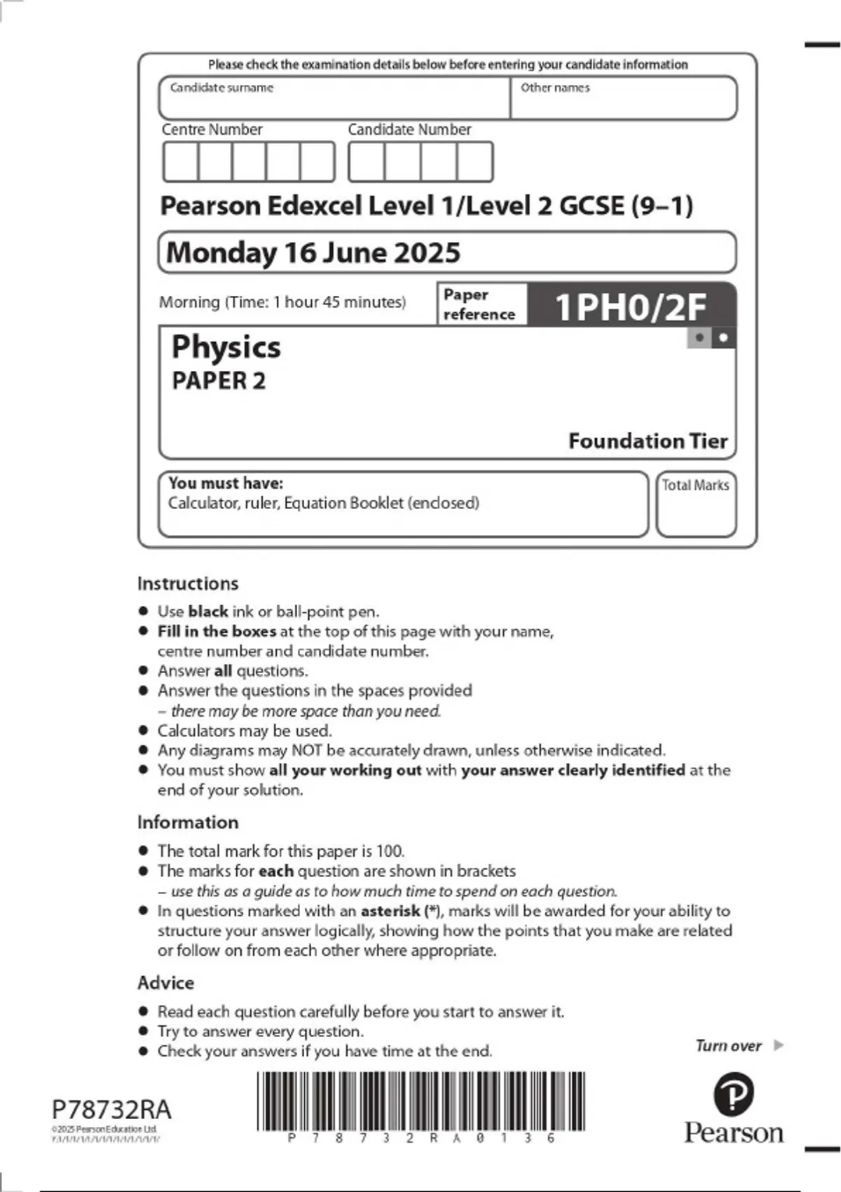 GCSE EDEXCEL 2025 Foundation Triple Science: Trilogy Physics Paper 2 Inc Mark Scheme