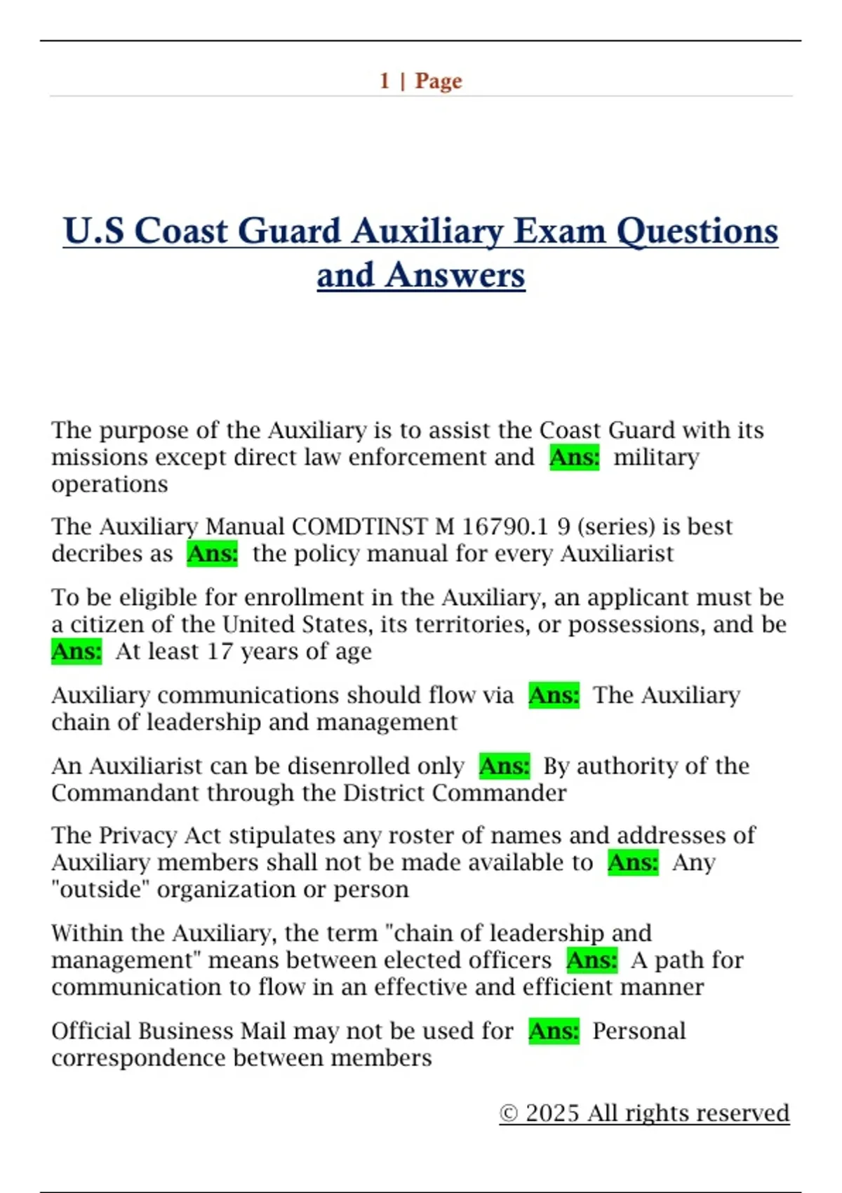 U.S Coast Guard Auxiliary Exam Questions and Answers