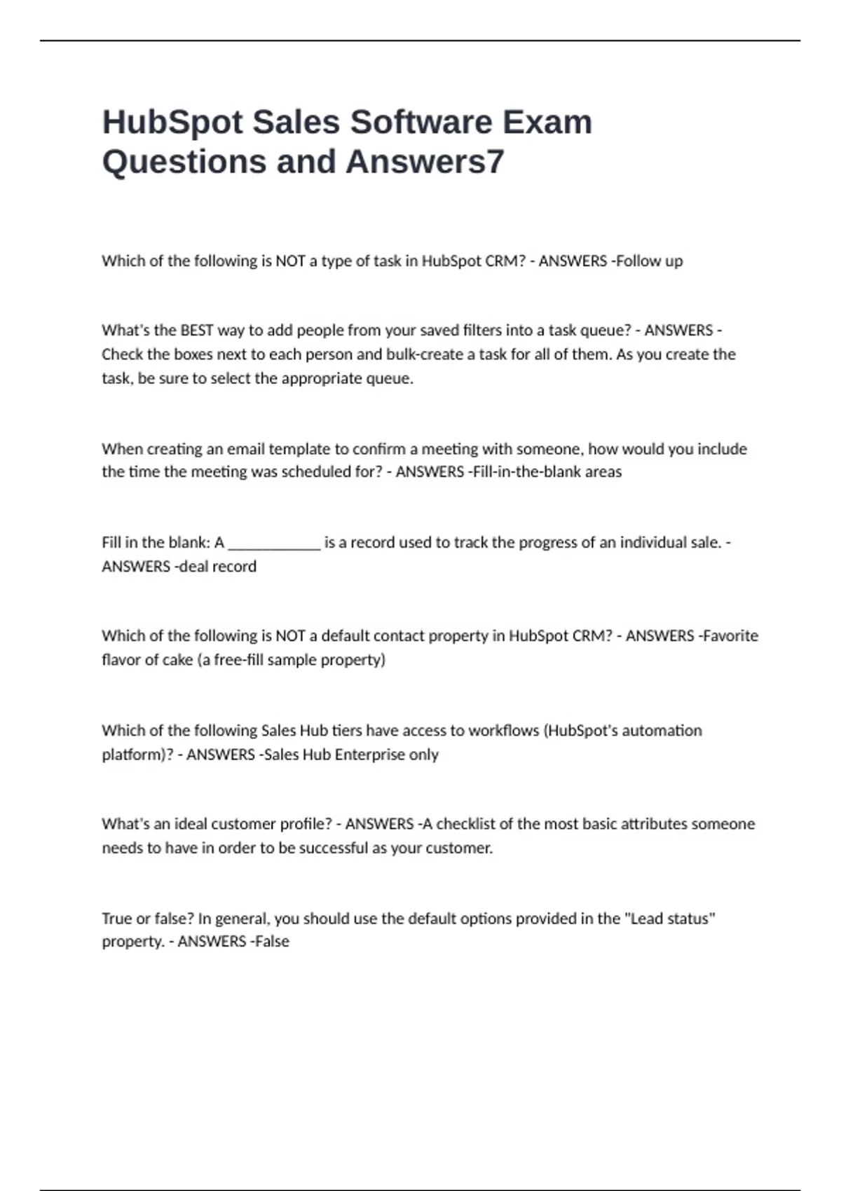 HubSpot Sales Software Exam Questions and Answers Which of the following is NOT a type of task in HubSpot CRM? - ANSWERS -Follow up What's the BEST way to add people from your saved filters into a task queue? - ANSWERS -Check the boxes next to each person and bulk-create a task for all of them. As you create the task, be sure to select the appropriate queue. When creating an email template to confirm a meeting with someone, how would you include the time the meeting was scheduled for? - ANSWERS -Fill-in-the-blank areas Fill in the blank: A ___________ is a record used to track the progress of an individual sale. - ANSWERS -deal record Which of the following is NOT a default contact property in HubSpot CRM? - ANSWERS -Favorite flavor of cake (a free-fill sample property) Which of the following Sales Hub tiers have access to workflows (HubSpot's automation platform)? - ANSWERS -Sales Hub Enterprise only What's an ideal customer profile? - ANSWERS -A checklist of the most basic attributes someone needs to have in order to be successful as your customer. True or false? In general, you should use the default options provided in the "Lead status" property. - ANSWERS -False