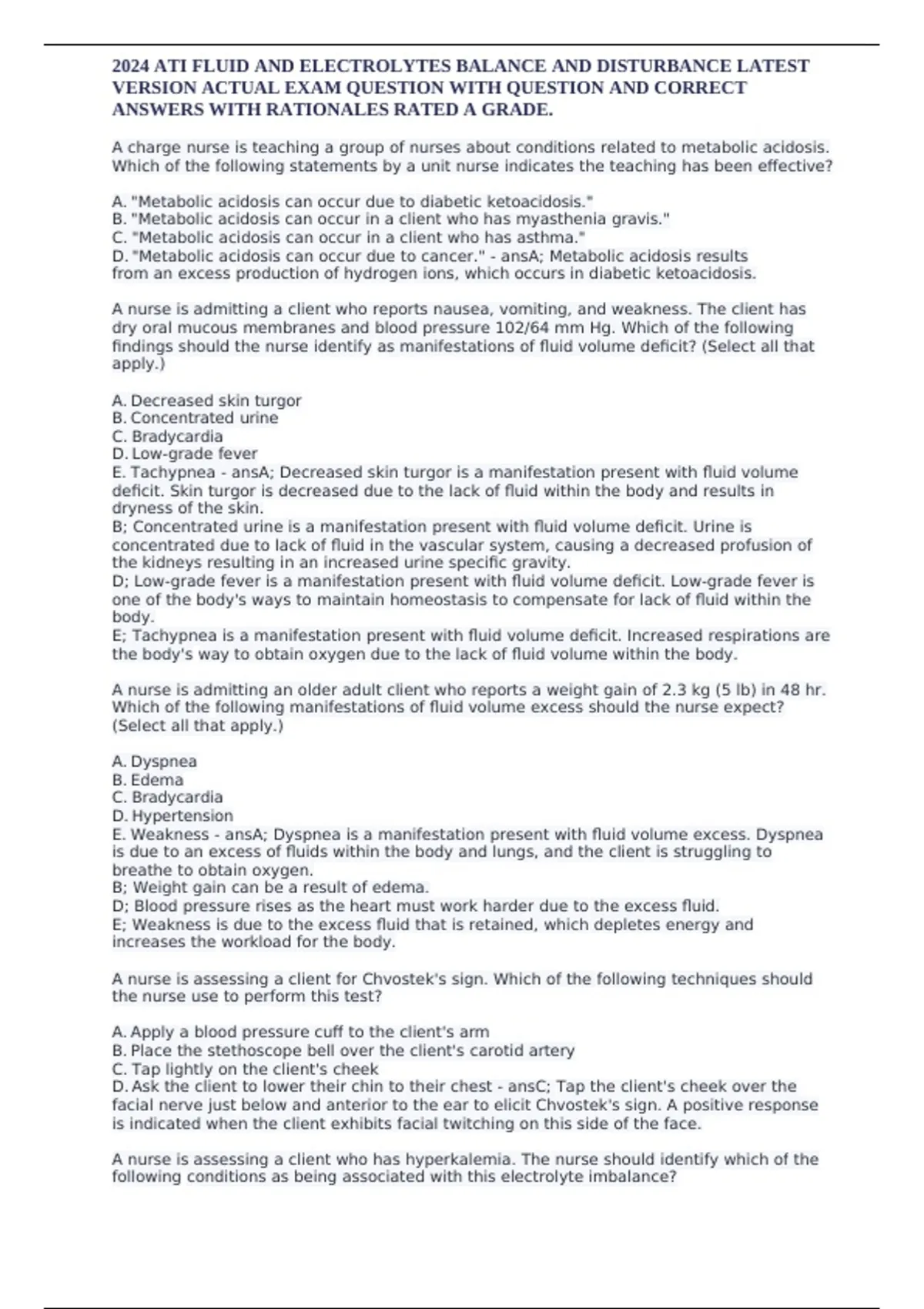 2024 ATI FLUID AND ELECTROLYTES BALANCE AND DISTURBANCE LATEST VERSION ACTUAL EXAM
