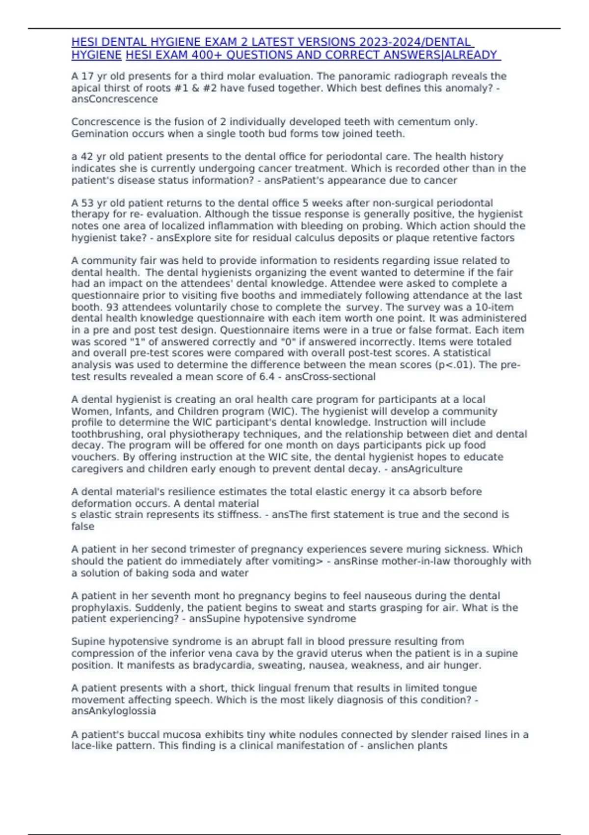 HESI DENTAL HYGIENE EXAM 2 LATEST VERSIONS DENTAL HYGIENE HESI EXAM 400+