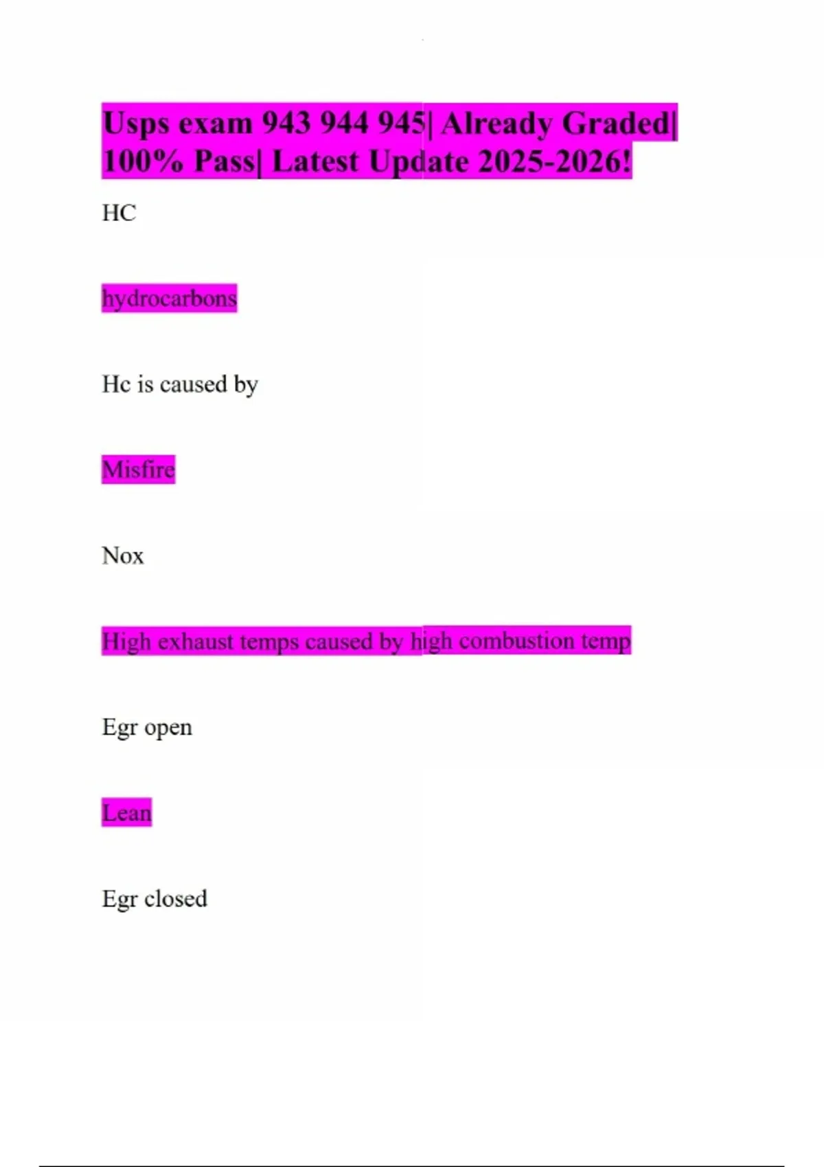 Usps exam | Already Graded| 100% Pass| Latest Update ! HC hydrocarbons Hc is caused by Misfire Nox High exhaust temps caused by high combustion temp Egr open Lean Egr closed