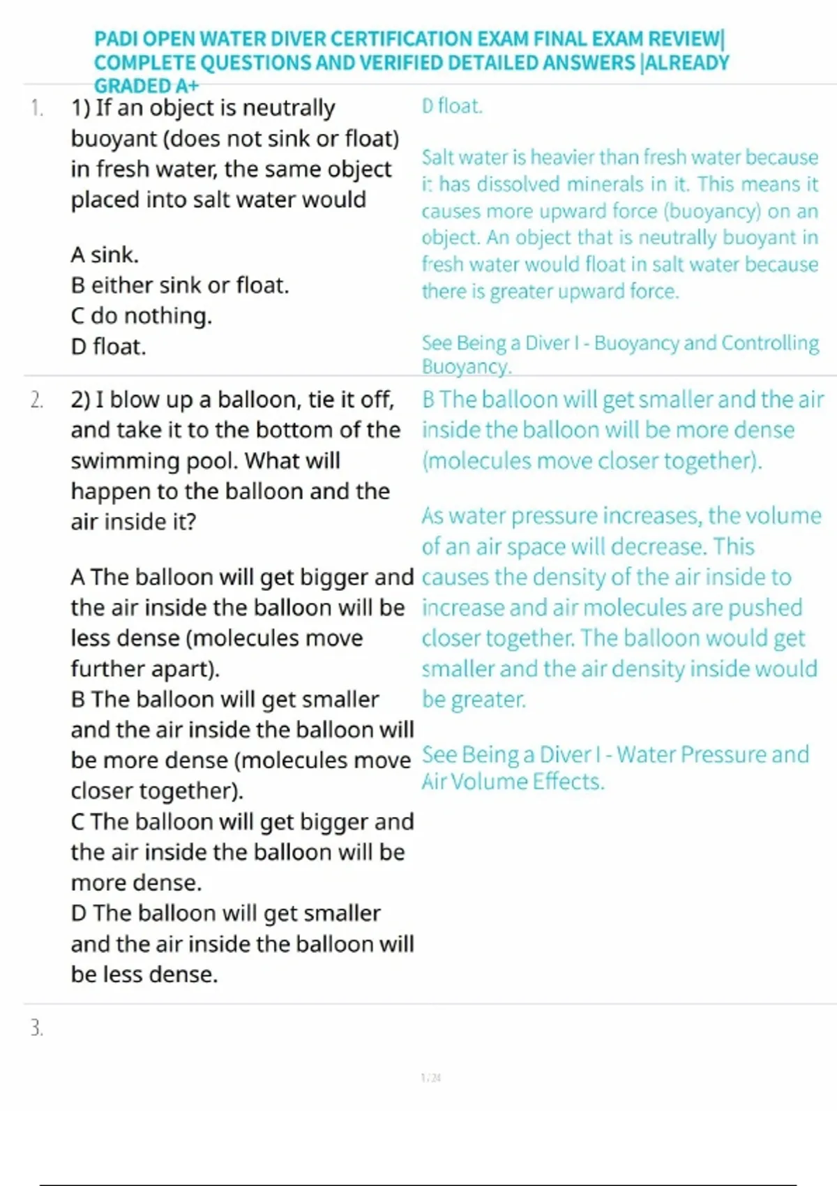PADI OPEN WATER DIVER CERTIFICATION EXAM FINAL EXAM REVIEW|COMPLETE QUESTIONS AND VERIFIED DETAILED ANSWERS |ALREADY GRADED A+