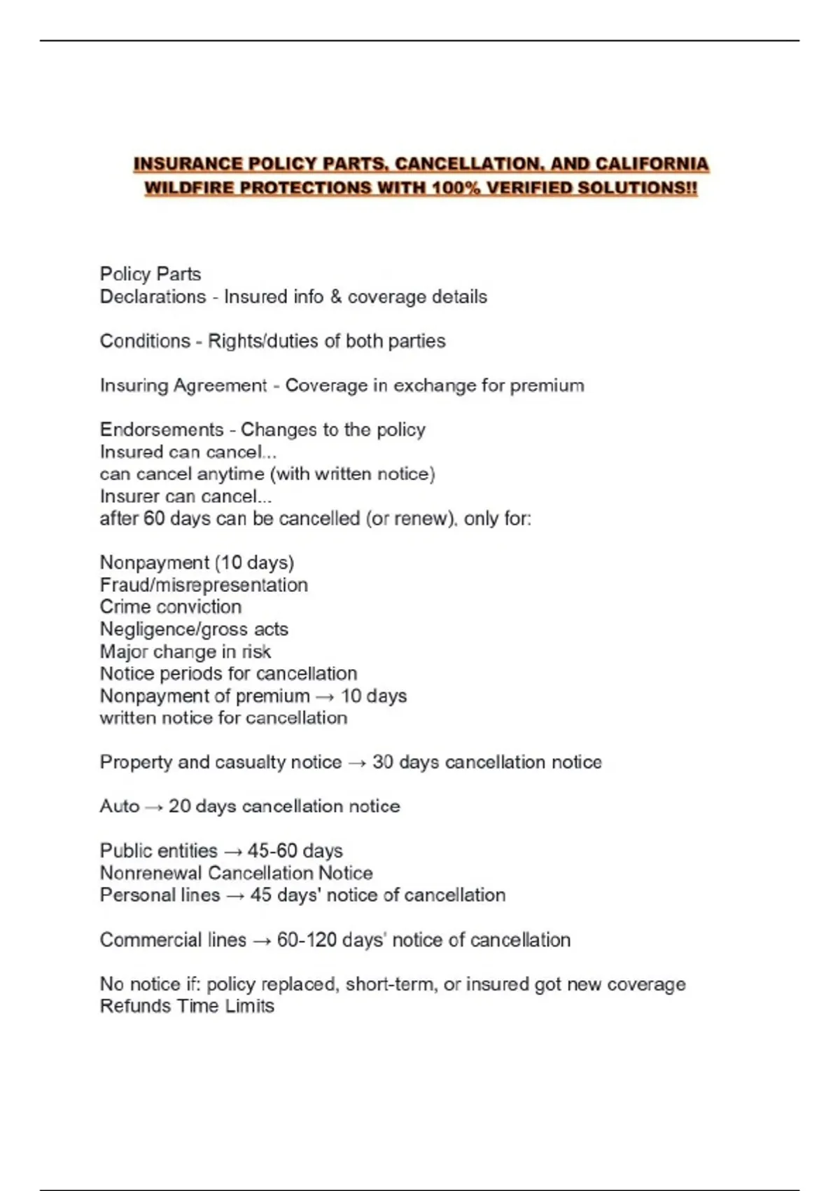 INSURANCE POLICY PARTS, CANCELLATION, AND CALIFORNIA WILDFIRE PROTECTIONS WITH 100% VERIFIED SOLUTIONS!!