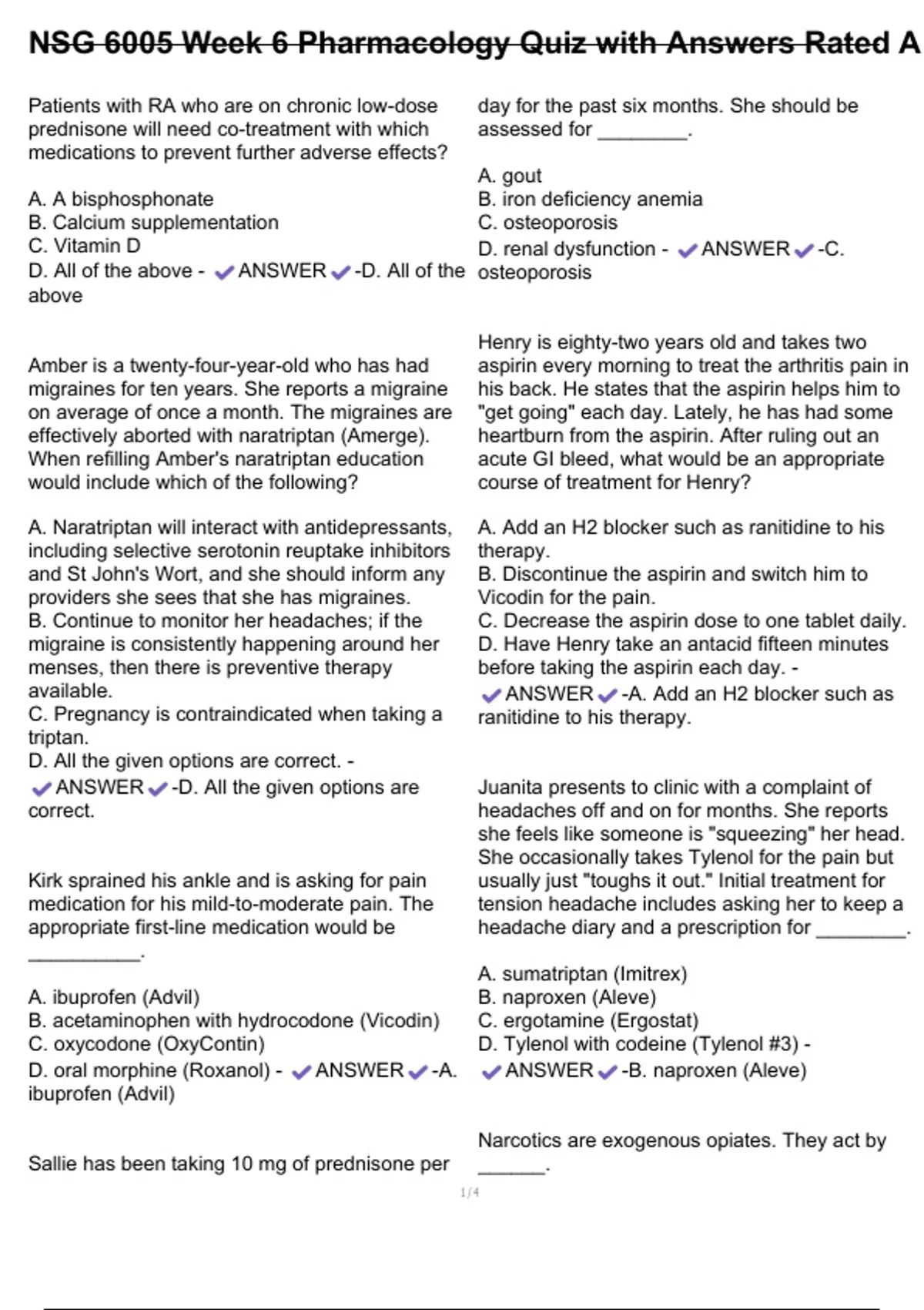 Patients with RA who are on chronic low-dose prednisone will need co-treatment with which medications to prevent further adverse effects? A. A bisphosphonate B. Calcium supplementation C. Vitamin D D. All of the above - ANSWER -D. All of the above Amber is a twenty-four-year-old who has had migraines
