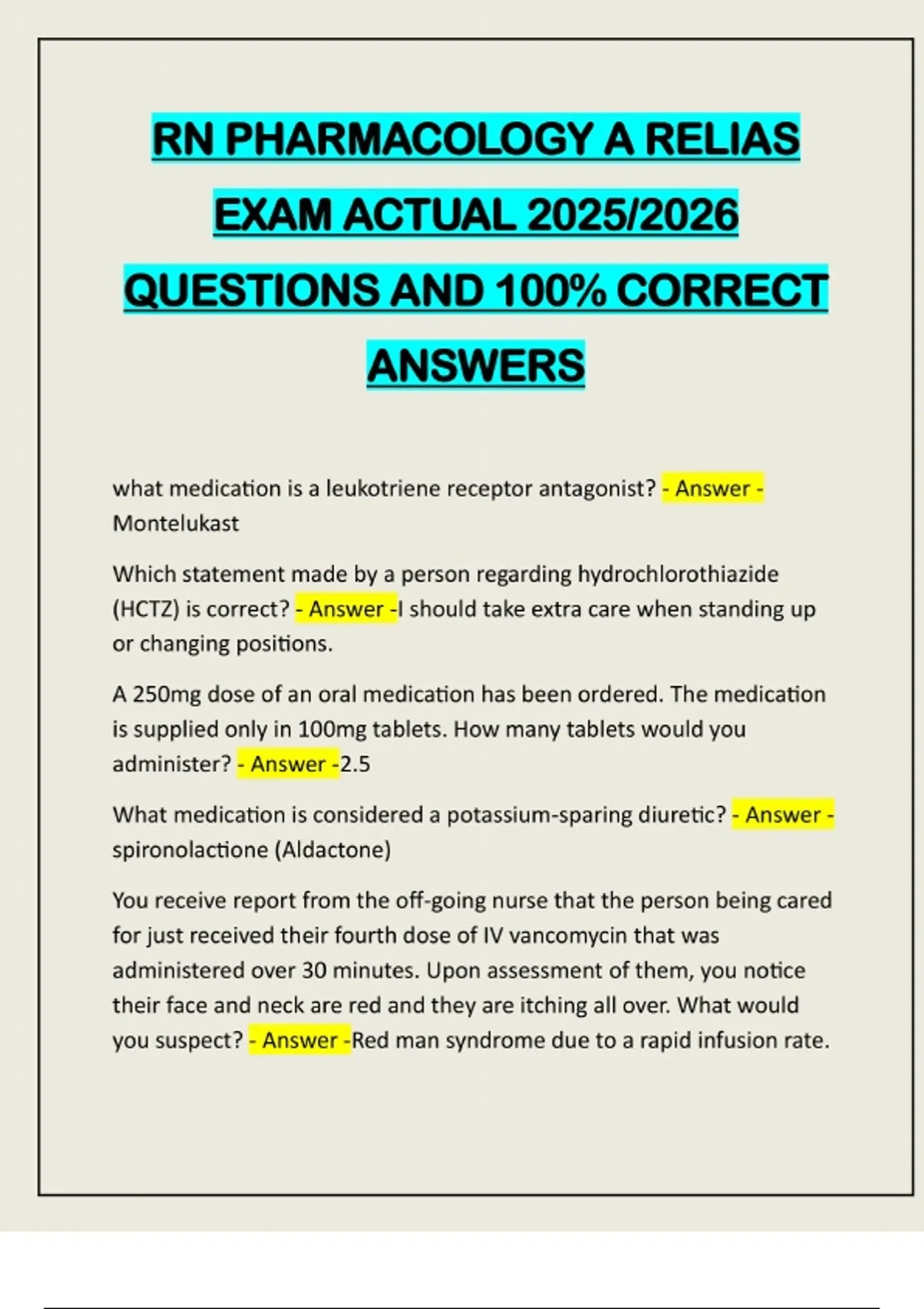RN PHARMACOLOGY A RELIAS EXAM ACTUAL 2025/2026 QUESTIONS AND 100% CORRECT ANSWERS what medication is a leukotriene receptor antagonist? - Answer - Montelukast Which statement made by a person regarding hydrochlorothiazide (HCTZ) is correct? - Answer -I should take extra care when standing up or changing positions. A 250mg dose of an oral medication has been ordered. The medication is supplied only in 100mg tablets. How many tablets would you administer? - Answer -2.5 What medication is considered a potassium-sparing diuretic? - Answer - spironolactione (Aldactone) You receive report from the off-going nurse that the person being cared for just received their fourth dose of IV vancomycin that was administered over 30 minutes. Upon assessment of them, you notice their face and neck are red and they are itching all over. What would you suspect? - Answer -Red man syndrome due to a rapid infusion rate.Which of the following would you question if prescribed for a person taking sildenafil (Viagra? - Answer -nitroglycerin You are caring for a person with a capillary blood glucose of 33 mg/dL and they are unable to tolerate oral intake. Which of the following would you administer? - Answer -dextrose 50% IV push A physician's written order for the person you are caring for is as follows: Insulin glargine (Lantus), 10 U, subQ QD. What changes would you suggest for safety and to avoid the use of "do not use" abbreviations? - Answer -spell out units and daily Which statement, if made by the person you are caring for, reflects the need for further education regarding a new prescriptions of warfarin (Coumadin)? - Answer -If I get headaches, aspirin is my best options for pain A person is noted to have a penicillin allergy. What medication would you question of ordered by a physician? - Answer -ceftriaxone You receive and order to start a Heparin drip at 18 units/kg/hr for a person weighing 75 kg. The heparin comes in a 500 mL bag with 25,000 units. what is the starting rate of the infusion? - Answer -27 mL/hr The physician orders 0.5 mg/kg of a medications. The medication is supplied in a 10 mg/mL solution. The person you are caring for weighs 40 kg. How many mL of the drug would you administer?f - Answer -2 mL A person with a hypothyroidism has a serum calcium level of 13 mg/dL. What medication would you expect to administer? - Answer -Calcitonin A person you are caring for has a known GI bleed. What drug is contraindicated? - Answer -enoxaparin (Lovenox)
