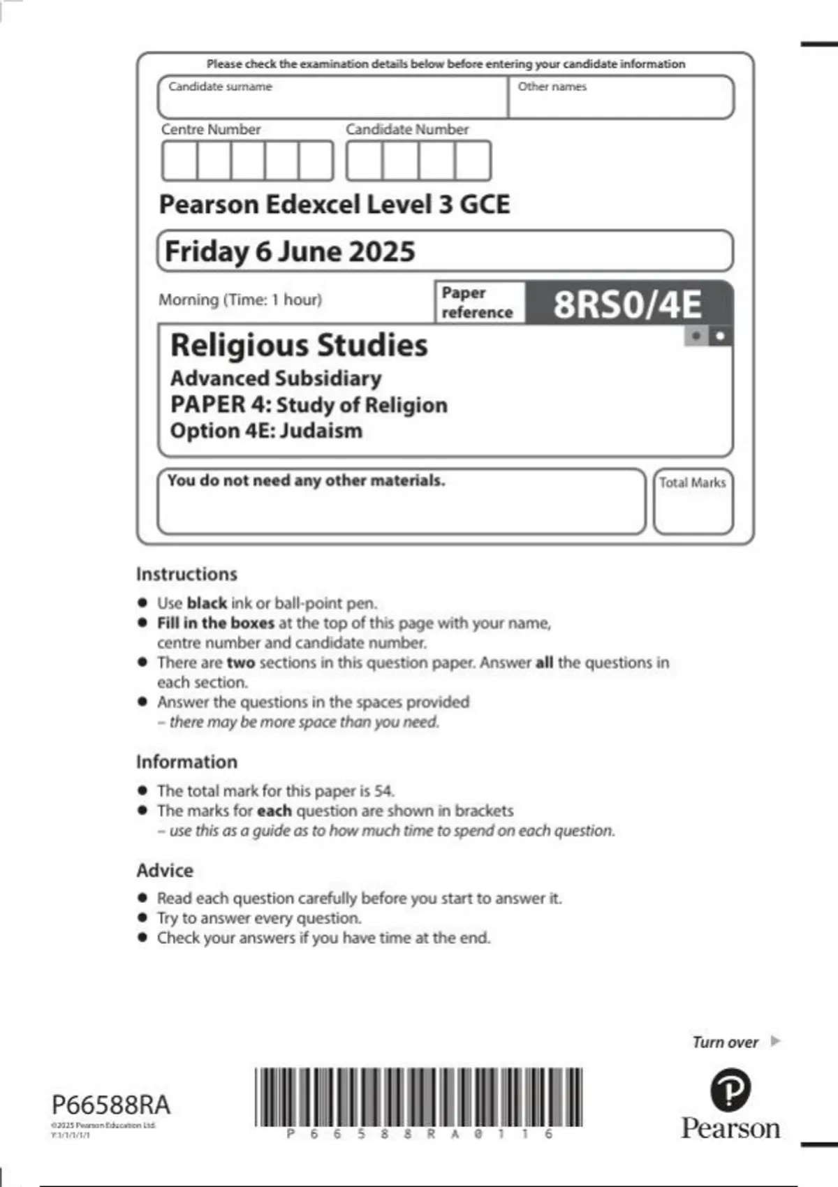 Pearson Edexcel Level 3 GCE Paper reference 8RS0/4E Religious Studies Advanced Subsidiary PAPER 4: Study of Religion Option 4E: Judaism June 2025