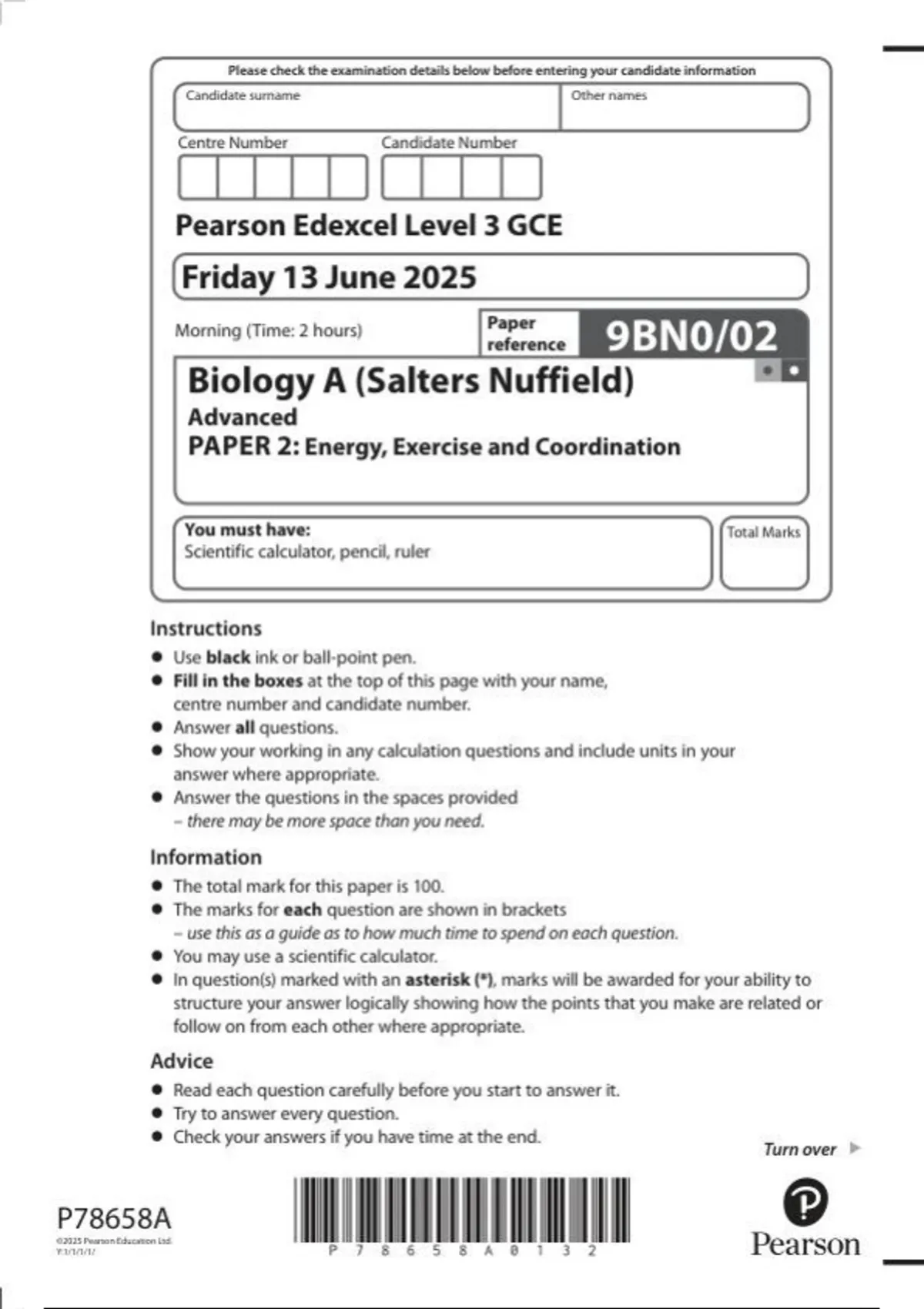 Pearson Edexcel Level 3 GCE Paper reference 9BN0/02 Biology A (Salters Nuffield) Advanced PAPER 2: Energy, Exercise and Coordination June 2025