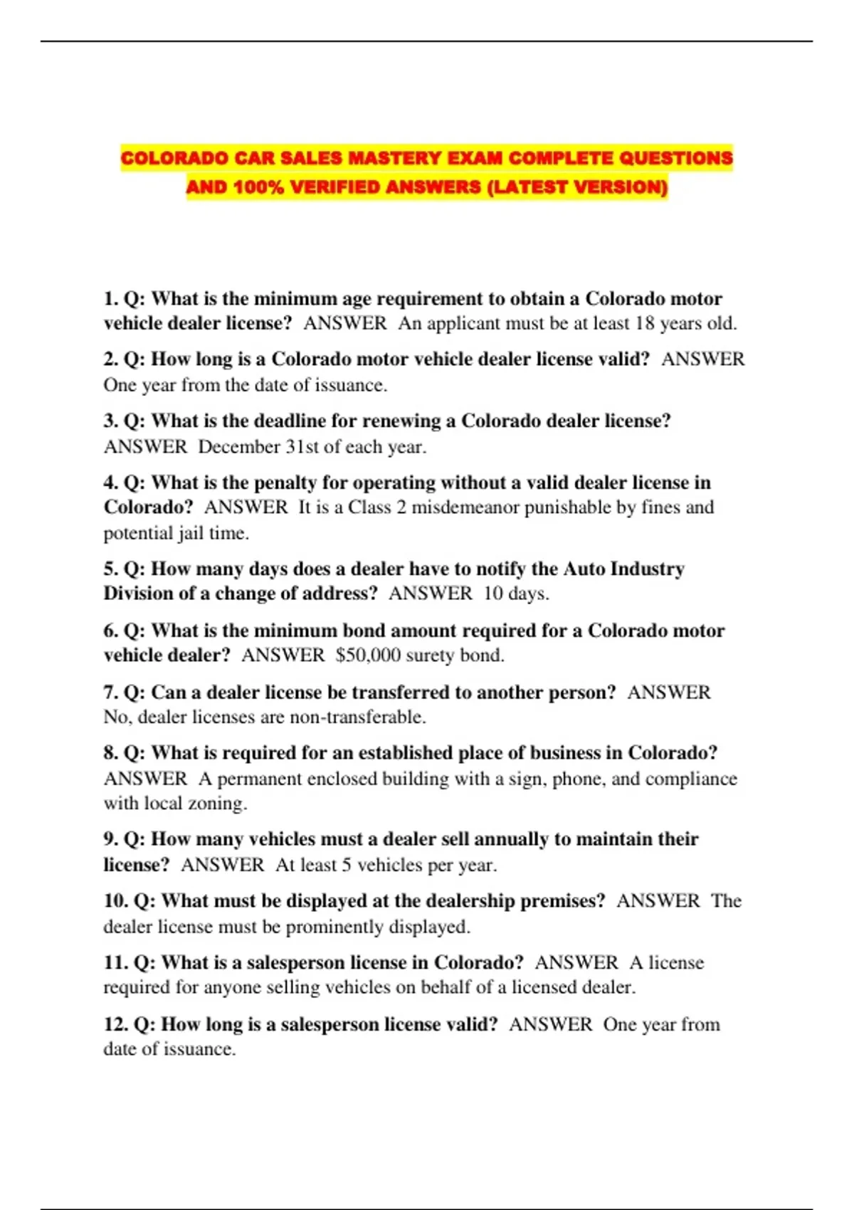 COLORADO CAR SALES MASTERY EXAM COMPLETE QUESTIONS