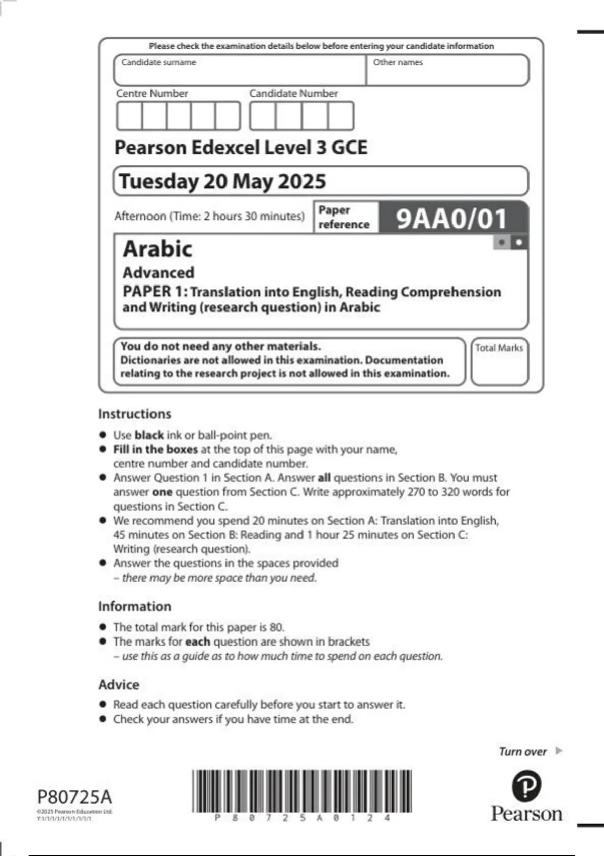 Pearson Edexcel a level Arabic question paper and mark scheme June 2025 9AA0/01