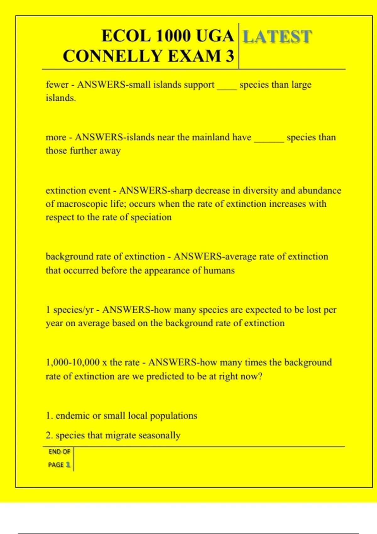 ECOL 1000 UGA CONNELLY EXAM 3 QUESTIONS AND ANSWERS 2025
