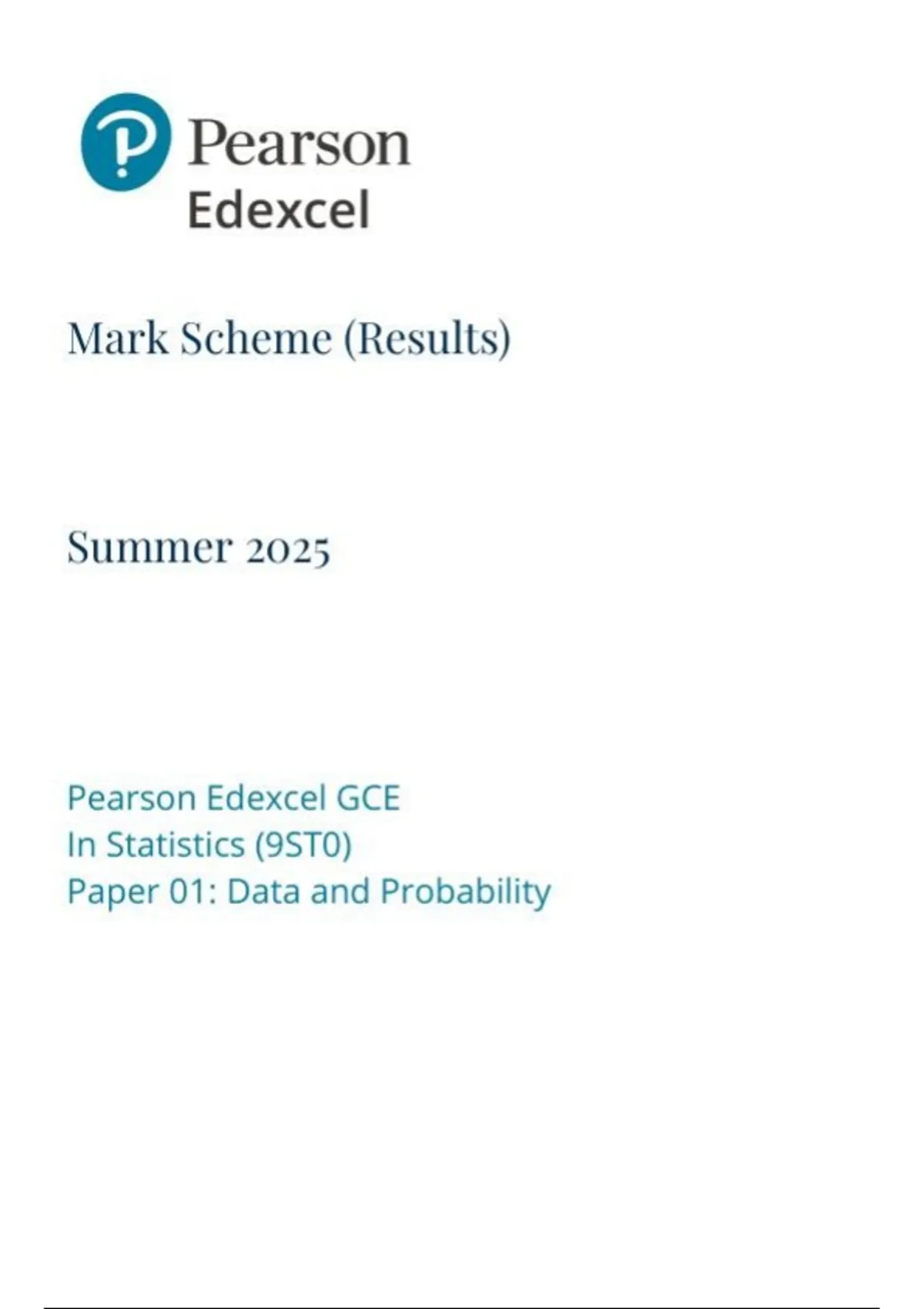 EDEXCEL statistics 9st0-01 paper 1- data and probability mark scheme june-2025