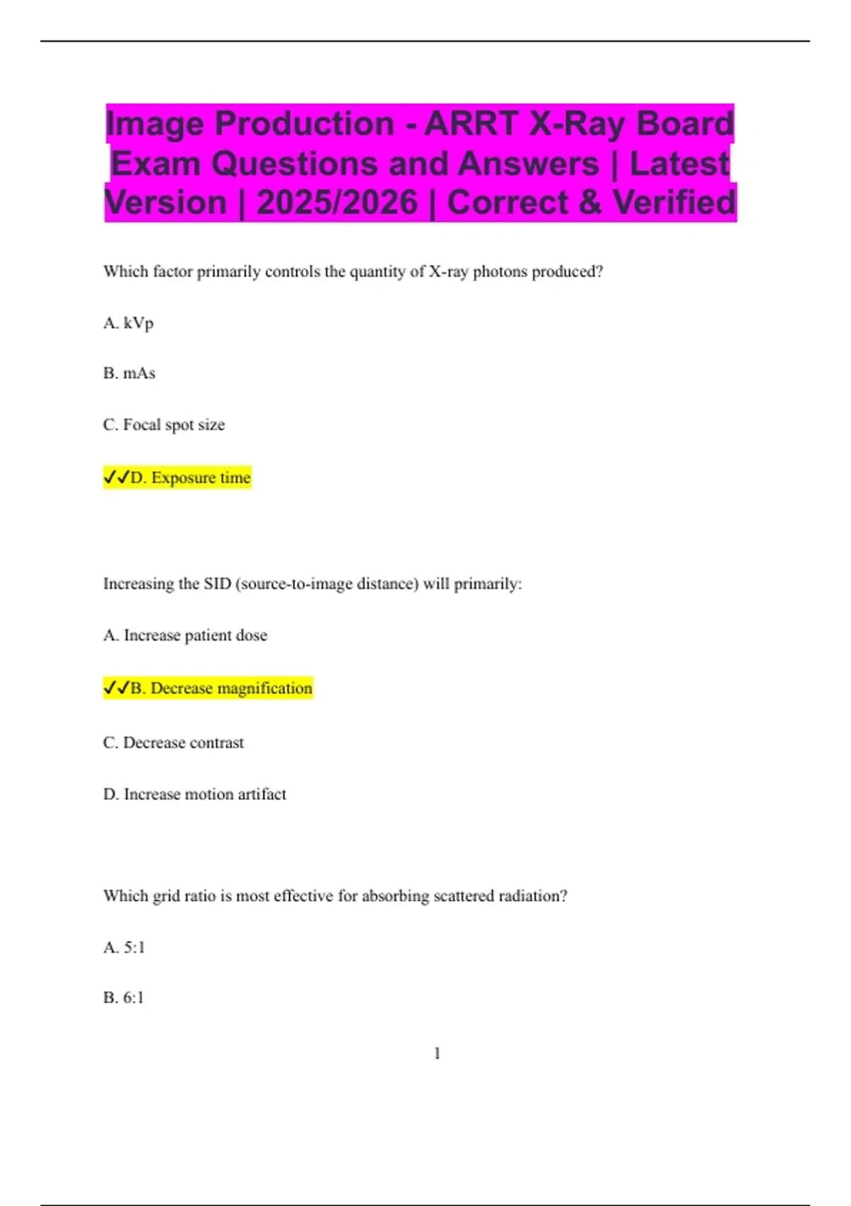 Image Production - ARRT X-Ray Board Exam Questions and Answers | Latest Version | 2025/2026 | Correct & Verified Which factor primarily controls the quantity of X-ray photons produced? A. kVp B. mAs C. Focal spot size D. Exposure time Increasing the SID (source-to-image distance) will primarily: A. Increase patient dose B. Decrease magnification C. Decrease contrast D. Increase motion artifact Which grid ratio is most effective for absorbing scattered radiation? A. 5:1 B. 6:1 2 C. 12:1 D. 8:1 The anode heel effect is most noticeable with: A. Small focal spot and short SID B. Large focal spot and long SID C. Large field size and short SID D. Small field size and long SID Which factor has the greatest effect on radiographic contrast? A. mAs B. kVp C. SID D. Focal spot size Which type of digital artifact occurs from detector malfunction? A. Motion blur B. Quantum noise 3 C. Dead pixel artifact D. Grid cutoff What is the main purpose of a compensating filter? A. Increase magnification B. Equalize exposure across varying tissue thicknesses C. Reduce scatter D. Increase spatial resolution Which type of focal spot is used for detailed extremity imaging? A. Large B. Small C. Medium D. Variable Increasing kVp while keeping mAs constant will: A. Decrease penetration B. Increase penetration