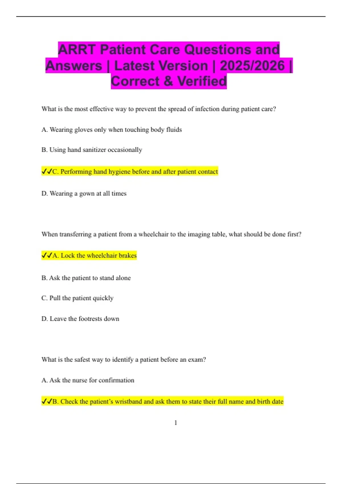 ARRT Patient Care Questions and Answers | Latest Version | 2025/2026 | Correct & Verified What is the most effective way to prevent the spread of infection during patient care? A. Wearing gloves only when touching body fluids B. Using hand sanitizer occasionally C. Performing hand hygiene before and after patient contact D. Wearing a gown at all times When transferring a patient from a wheelchair to the imaging table, what should be done first? A. Lock the wheelchair brakes B. Ask the patient to stand alone C. Pull the patient quickly D. Leave the footrests down What is the safest way to identify a patient before an exam? A. Ask the nurse for confirmation B. Check the patient’s wristband and ask them to state their full name and birth date 2 C. Look at the patient’s face D. Ask family members If a patient faints during a procedure, what should you do first? A. Run to get the doctor B. Assist the patient to a safe position and elevate their legs C. Give the patient food D. Continue the procedure Which type of isolation is required for a patient with tuberculosis? A. Contact isolation B. Droplet isolation C. Airborne isolation D. Reverse isolation When performing CPR on an adult, what is the correct compression depth? A. 1 inch B. 2 inches 3 C. 3 inches D. 1⁄2 inch What should you do if a patient refuses an exam after signing consent? A. Convince the patient to proceed B. Respect their decision and notify the radiologist C. Continue the exam anyway D. Ignore their refusal The primary purpose of informed consent is to: A. Ensure the patient understands and agrees to the procedure B. Protect the technologist from liability C. Speed up workflow D. Allow billing to proceed What should you do if a patient begins vomiting during an exam? A. Step back and wait B. Turn the patient to the side and provide an emesis basin