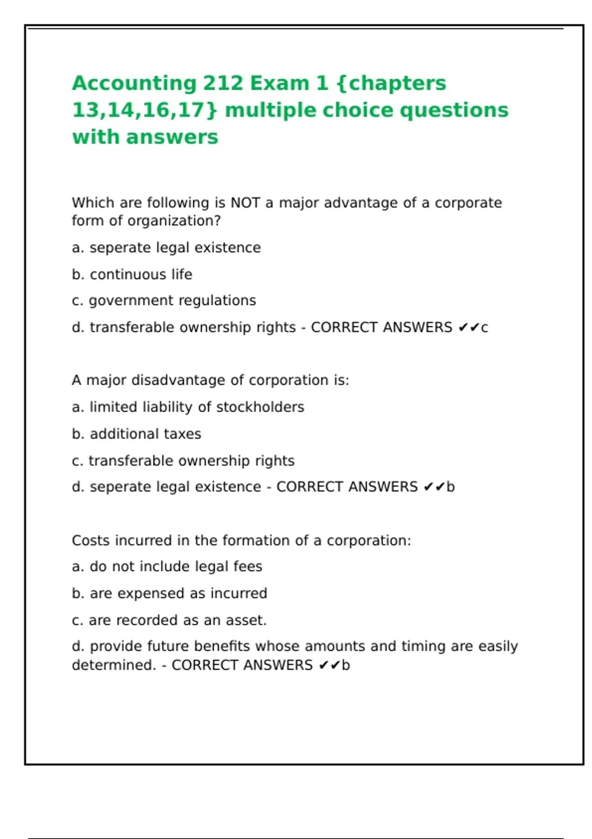 d. seperate legal existence - CORRECT ANSWERS ✔✔b