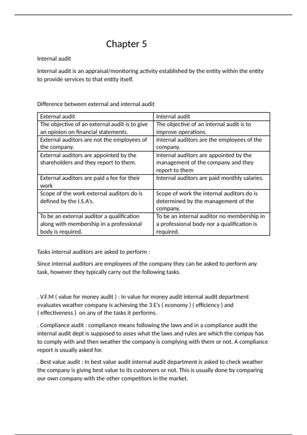External auditors are paid a fee for their Internal auditors are paid monthly salaries.