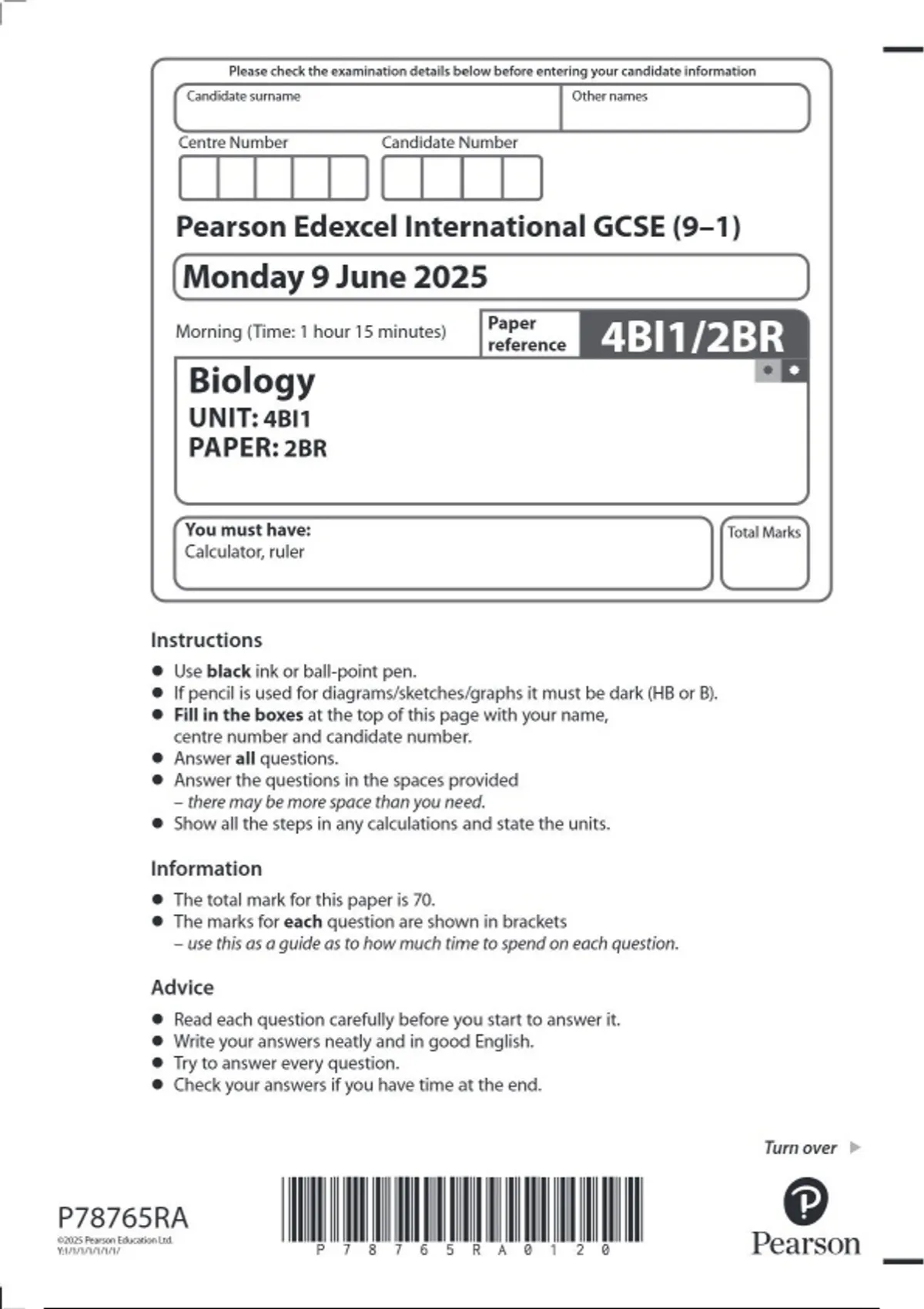 Pearson Edexcel International GCSE (9-1) Paper reference 4BI1/2BR Biology UNIT: 4BI1 PAPER: 2BR June 2025