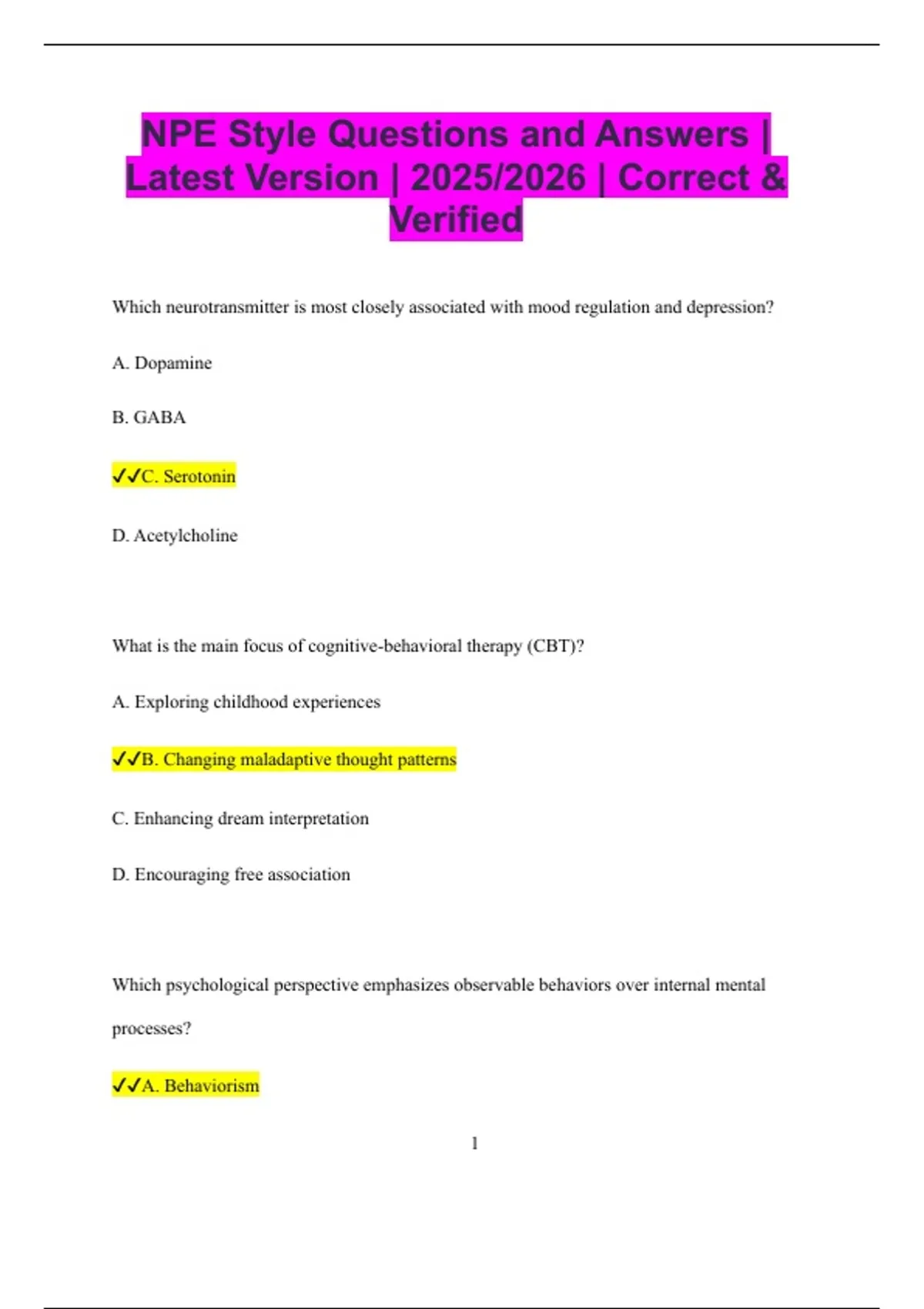 NPE Style Questions and Answers | Latest Version | 2025/2026 | Correct & Verified Which neurotransmitter is most closely associated with mood regulation and depression? A. Dopamine B. GABA C. Serotonin D. Acetylcholine What is the main focus of cognitive-behavioral therapy (CBT)? A. Exploring childhood experiences B. Changing maladaptive thought patterns C. Enhancing dream interpretation D. Encouraging free association Which psychological perspective emphasizes observable behaviors over internal mental processes? A. Behaviorism 2 B. Psychoanalysis C. Humanistic D. Cognitive Which stage of Erikson’s psychosocial development occurs during adolescence? A. Intimacy vs. Isolation B. Identity vs. Role Confusion C. Industry vs. Inferiority D. Trust vs. Mistrust What is the primary purpose of a projective psychological test? A. Measure intelligence B. Assess personality through structured questions C. Reveal unconscious thoughts and feelings D. Evaluate specific cognitive skills Which part of the brain is primarily involved in memory formation? A. Cerebellum 3 B. Hippocampus C. Medulla oblongata D. Amygdala What does the term “classical conditioning” describe? A. Learning through consequences B. Learning through association C. Observational learning D. Cognitive restructuring Which disorder is characterized by persistent, intrusive thoughts and repetitive behaviors? A. Major depressive disorder B. Bipolar disorder C. Obsessive-compulsive disorder (OCD) D. Generalized anxiety disorder Which research method involves in-depth study of a single individual or group? A. Case study 4 B. Survey C. Experiment D. Longitudinal study Which type of reinforcement increases the
