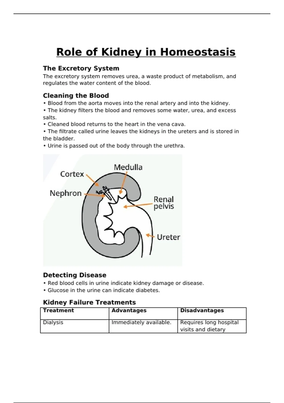 • The kidney filters the blood and removes some water, urea, and excess