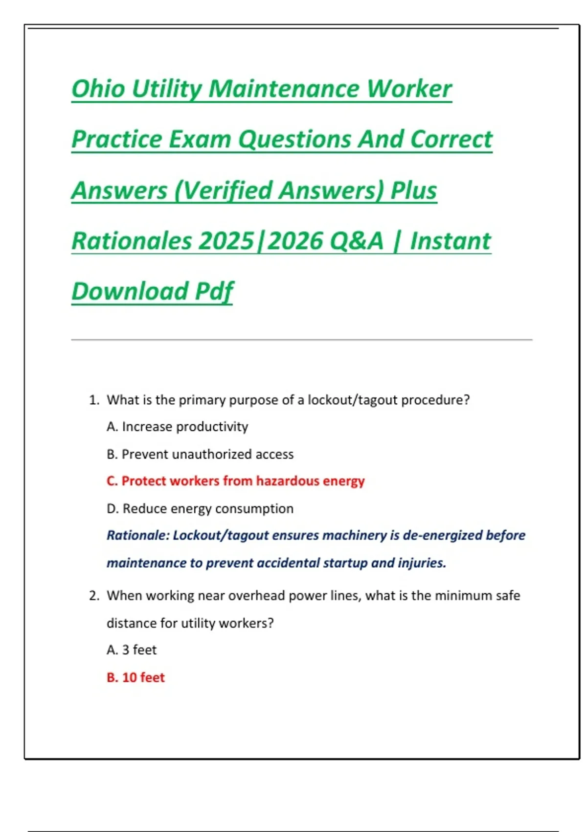 Ohio Utility Maintenance Worker Practice Exam Questions And Correct Answers (Verified Answers) Plus Rationales 2025|2026 Q&A | Instant Download Pdf
