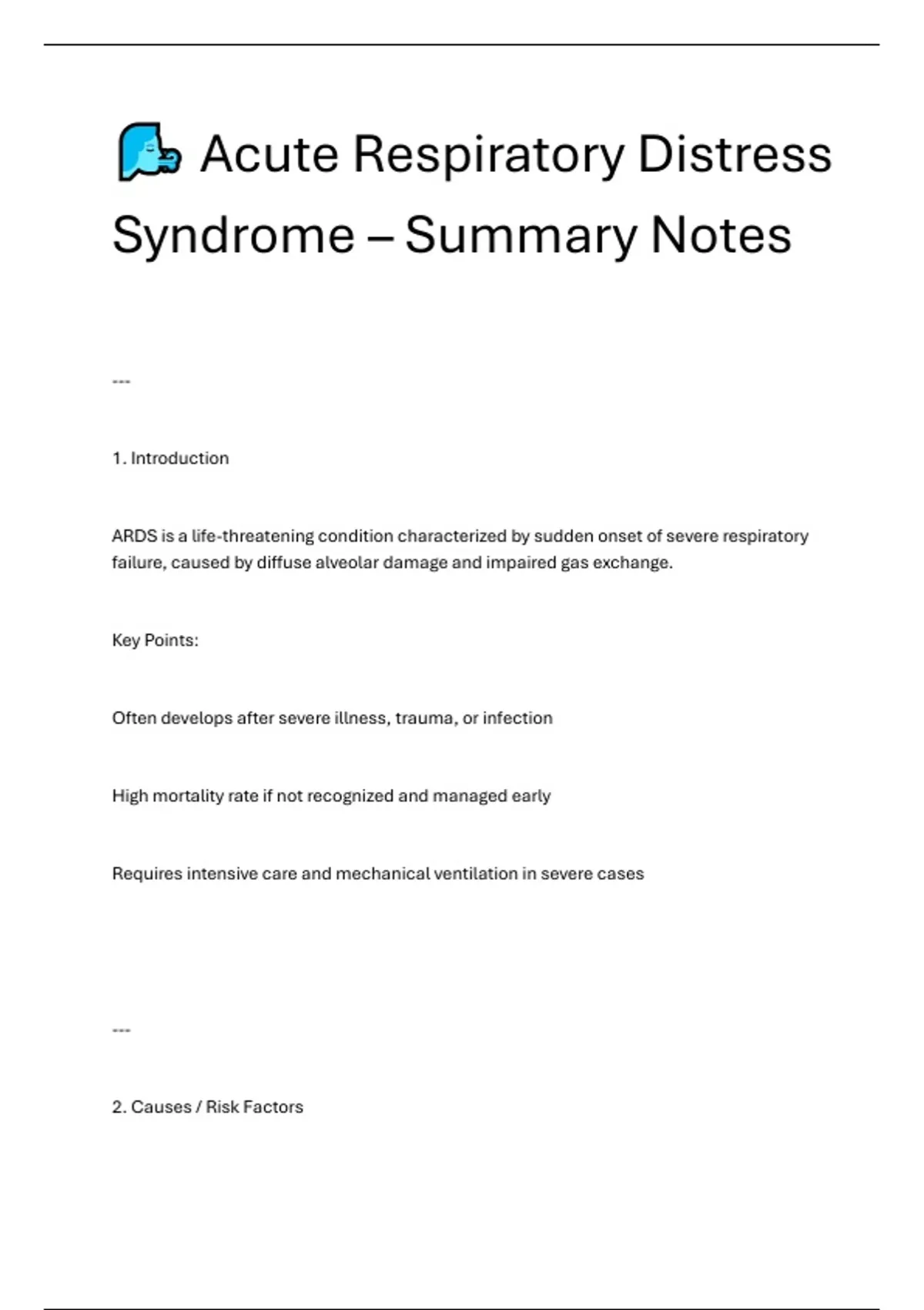 This summary note provides a detailed overview of Acute Respiratory Distress Syndrome (ARDS), a severe lung condition characterized by rapid onset of widespread inflammation in the lungs leading to fluid buildup in the alveoli and impaired oxygen exchange. It covers the causes, risk factors, signs and symptoms including severe shortness of breath and labored breathing, diagnostic criteria, potential complications, and standard treatments such as ventilator support and critical care interventions. This resource is ideal for medical, nursing, and allied health students seeking a concise yet comprehensive understanding of ARDS pathophysiology and clinical management.This format includes clear, relevant keywords to enhance searchability and a reference link to a respected medical resource for credibility. The description is concise and informative to attract students looking for efficient study material on ARDS