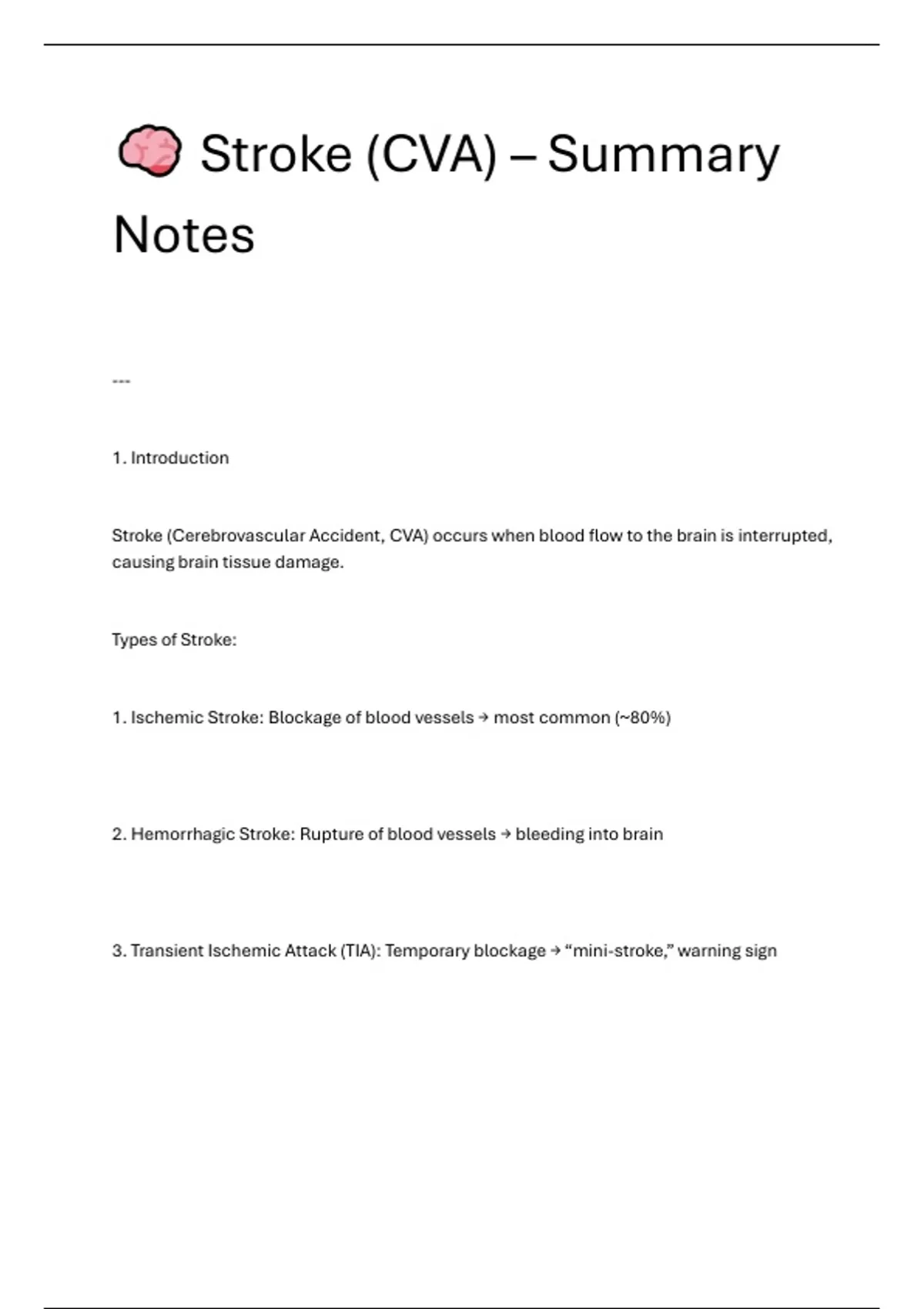 These Stroke (Cerebrovascular Accident – CVA) Summary Notes are written in simple, clear, and exam-focused language, perfect for BSc Nursing, GNM, and MBBS students who want to master the topic quickly. Inside this file, you’ll find: Definition and overview of Stroke (CVA) Types – Ischemic & Hemorrhagic stroke Causes, risk factors, and warning signs Simplified pathophysiology (easy to remember) Clinical features & diagnostic findings Medical and surgical management Nursing management and interventions (step-by-step) Complications & preventive measures Quick summary table for last-minute revision Why This File Stands Out: Written in student-friendly, exam-oriented format Includes key nursing care plans & priority actions Based on standard nursing textbooks Perfect for quick study, viva, or case presentation prep Print-friendly PDF – clean and organized