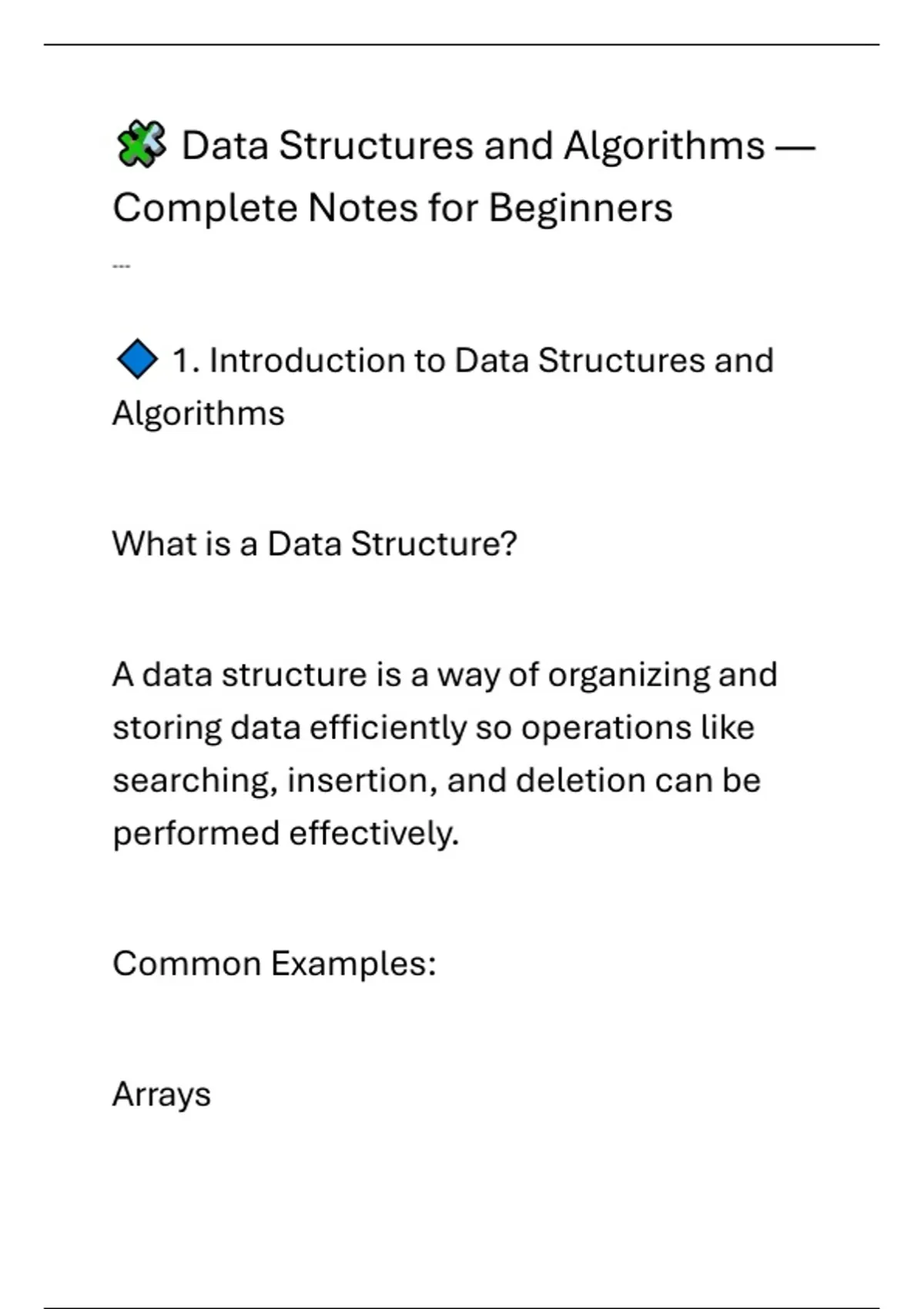 These Data Structures & Algorithms Summary Notes are written in simple, clear, and exam-oriented language, perfect for BCA, BSc IT, MCA, and computer science students who want to understand DSA concepts quickly and prepare effectively for exams. Contents Include: Introduction to Data Structures & Algorithms Arrays, Stacks, Queues, Linked Lists Trees – Binary, Binary Search Tree, AVL, and Heap Graphs – Representation, Traversal, Shortest Path Algorithms Sorting & Searching Algorithms – Bubble, Selection, Merge, Quick, Binary Search Recursion & Dynamic Programming Hashing & Hash Tables Complexity Analysis – Time & Space Complexity Key Tips, Diagrams, and Quick Revision Tables Why Students Love This File: Concise and easy-to-study format Includes examples, diagrams, and algorithm explanations Perfect for last-minute exam revision and assignments Printable PDF, organized for easy reading and reference Based on trusted textbooks and academic sources