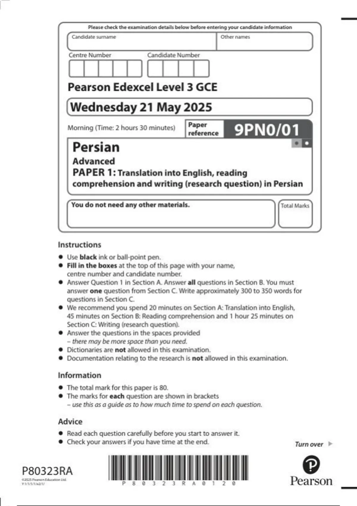 Pearson Edexcel a level Persian| question paper|2025|9PN0/01|