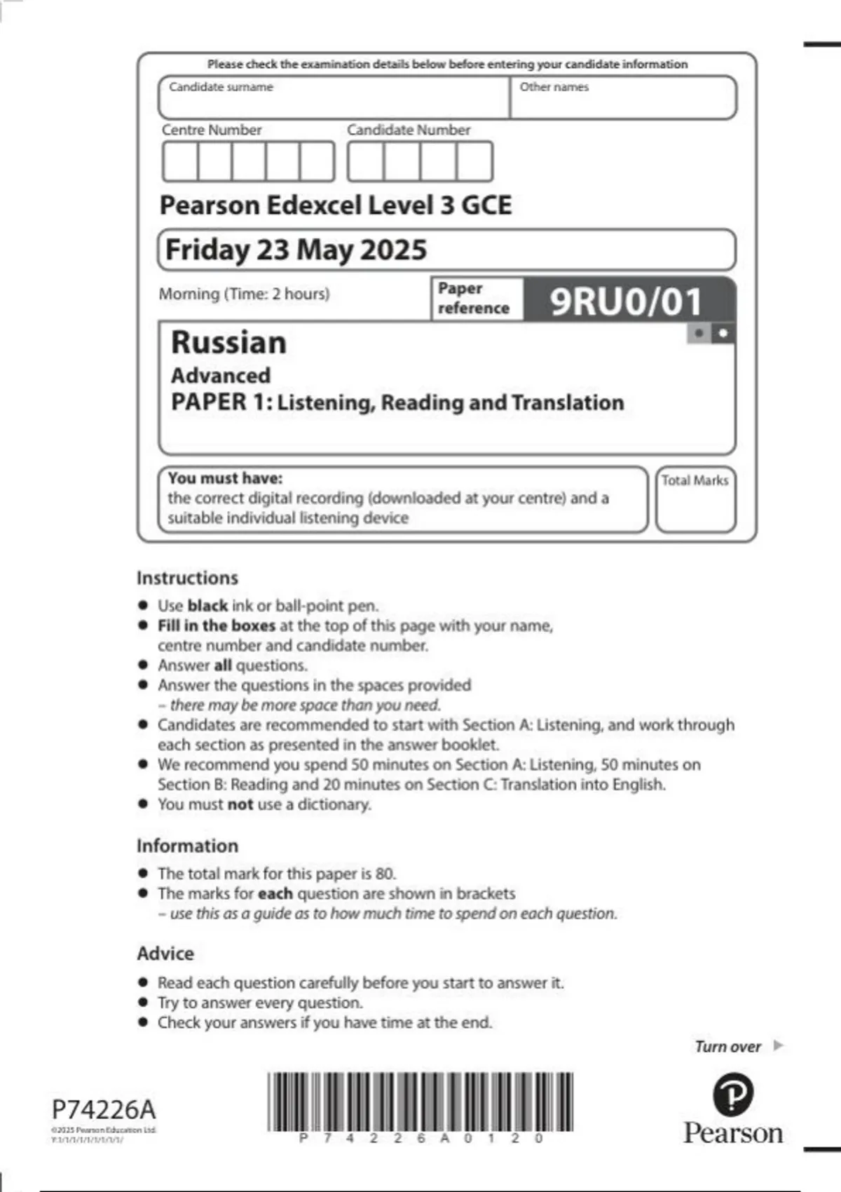 Pearson Edexcel a level Russian |question paper |2025|9RU0/01