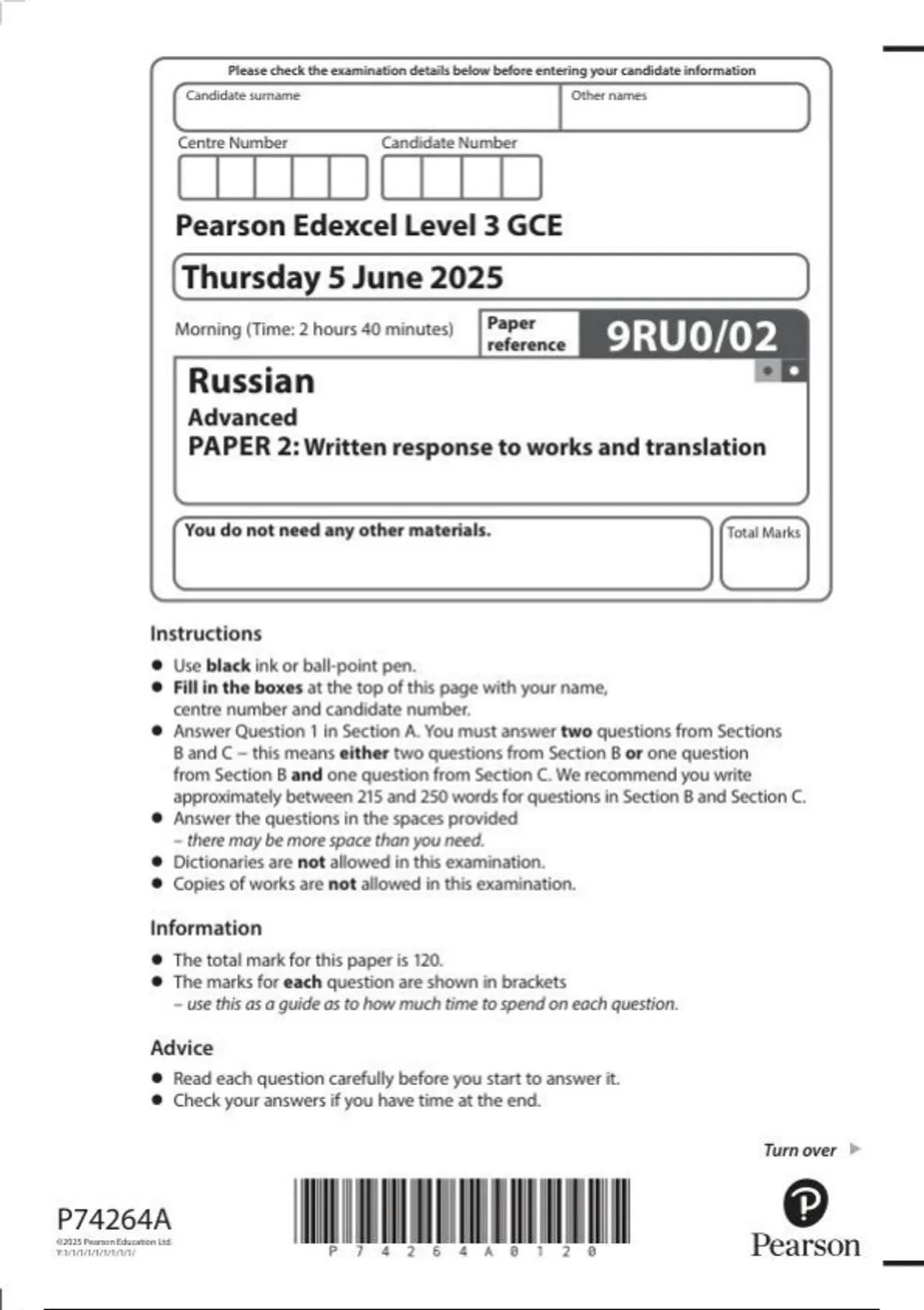 Pearson Edexcel a level Russian |question paper |2025|9RU0/02