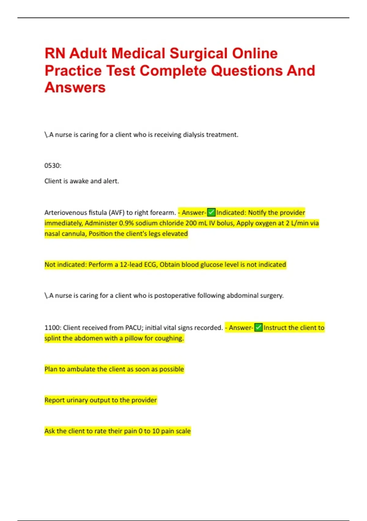 RN Adult Medical Surgical Online Practice Test Complete Questions And Answers .A nurse is caring for a client who is receiving dialysis treatment. 0530: Client is awake and alert. Arteriovenous fistula (AVF) to right forearm. - Answer-Indicated: Notify the provider immediately, Administer 0.9% sodium chloride 200 mL IV bolus, Apply oxygen at 2 L/min via nasal cannula, Position the client's legs elevated Not indicated: Perform a 12-lead ECG, Obtain blood glucose level is not indicated .A nurse is caring for a client who is postoperative following abdominal surgery. 1100: Client received from PACU; initial vital signs recorded. - Answer-Instruct the client to splint the abdomen with a pillow for coughing. Plan to ambulate the client as soon as possible Report urinary output to the provider Ask the client to rate their pain 0 to 10 pain scale .A nurse is caring for a client who is receiving total parenteral nutrition (TPN). a new bag is not available when the current infusion is nearly completed. - Answer-Administer dextrose 10% in water until the new bag arrives. .A nurse is caring for a client who had a nephrostomy tube inserted 12 hr ago. - Answer-The client reports back pain. .A nurse is caring for a client who is having a seizure. - Answer-Turn the client to the side. .A nurse in a provider's office is assessing a client who has hypertension and takes propranolol. - Answer-Reports of a night cough. .A nurse is planning to irrigate and dress a clean, granulating wound for a client who has a pressure injury. - Answer-Use a 30 mL syringe. .A nurse is assessing a client who has graves disease. Which of the following images should indicate to the nurse that the client has exophthalmos - Answer-Choose the one that's not a guy. It should be one with big bulging eyes staring at you. .A nurse is caring for a client who has DKA. Which of the following findings indicate improving? - Answer-Glucose 272 mg/dL .A nurse is caring for a client who has hypothyroidism. Which of the following manifestations should the nurse expect? - Answer-Constipation .A nurse is preparing to administer a blood transfusion to a client who has anemia. - Answer-check for the type and number of units of blood to administer. .a nurse is caring for a client who has a leg cast and is returning to demonstrate on the proper use of crutches while climbing stairs. - Answer-Place body weight on the crutches Advances the unaffected leg onto the stair Shifts weight from the crutches to the unaffected leg Brings the crutches and the affected leg up to the stair. .A nurse is teaching a group of newly licensed nurses about pain management for older adult clients. - Answer-Ibuprofen can cause gastrointestinal bleeding in older adult clients. .A nurse is teaching a client who has a family history of colorectal cancer. to help mitigate this risk, - Answer-Add cabbage to the diet .a nurse in an emergency department is caring for a client who has full-thickness burns over 20% of their total body surface area. After ensuring a patent airway and adminstering oxygen, - Answer-IV Fluids .a nurse is caring for a client who has terminal cancer. the client tells the nurse, "I wish I could stop these treatments" - Answer-Discontinuing with the treatments is your choice if it is your wish to do so. .a nurse is providing teaching to a client who has cancer and a new prescription for an opioid analgesic for pain management. - Answer-you should void every 4 hours to decrease the risk of urinary retention