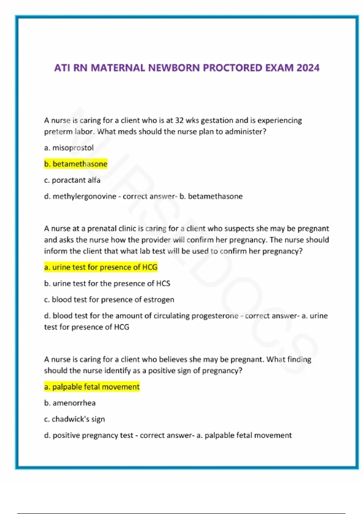 Test bank for RN ATI Maternal Newborn Proctored Exam 2023/2024 Actual Exam Questions & Solutions | Comprehensive Study Guide And Practice Test