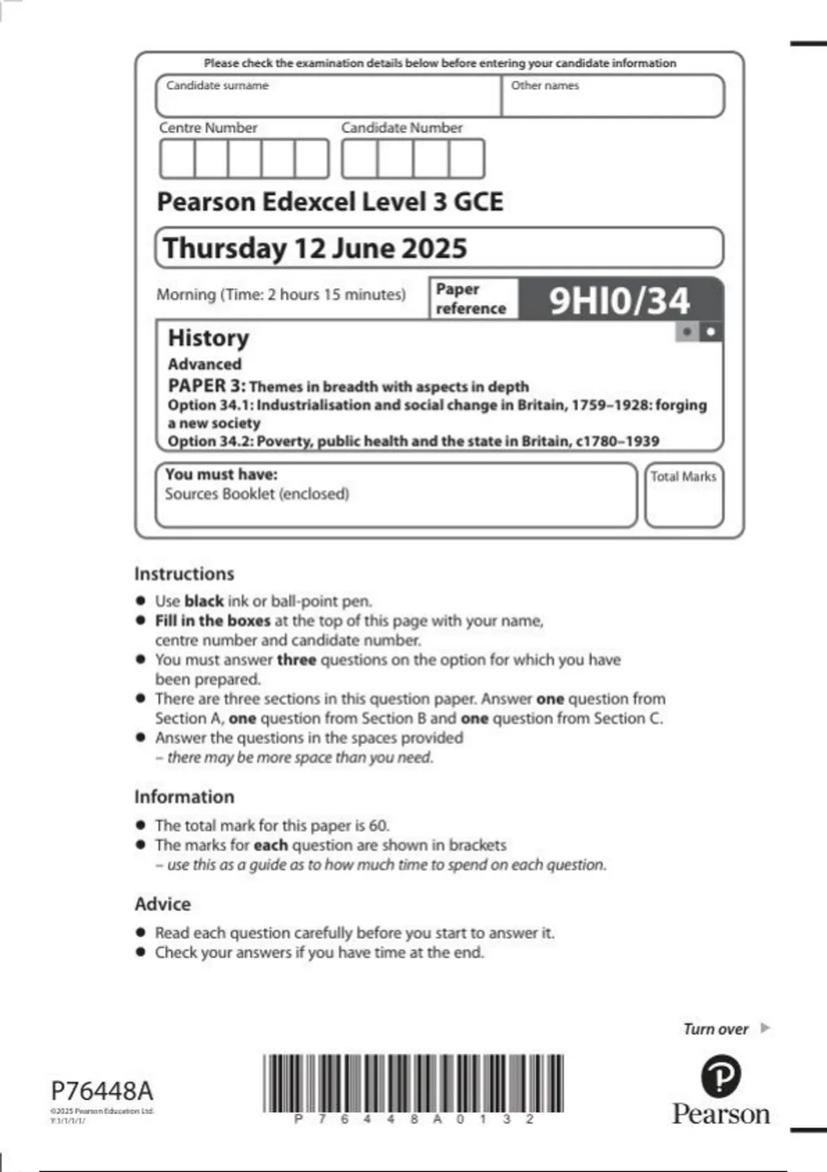 Pearson Edexcel a level History |question paper|2025|9HI0/34|