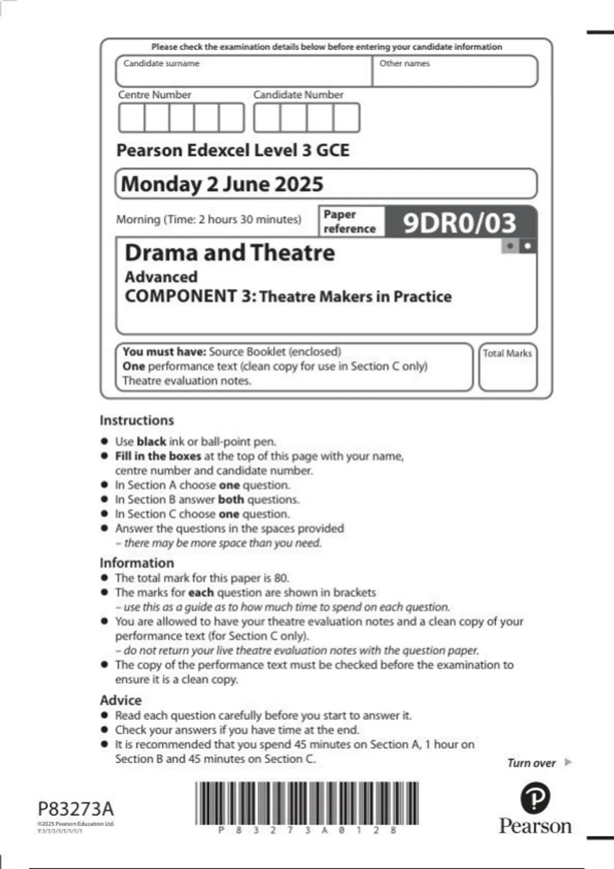 Pearson Edexcel a level Drama and Theatre| question paper|2025|9DR0/03|