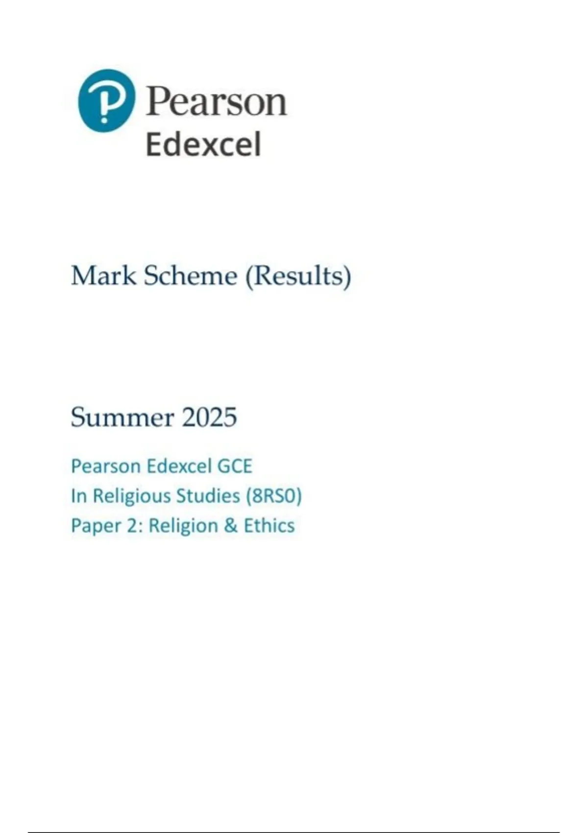 Pearson Edexcel as level Religious Studies |mark scheme |2025|8RS0/02