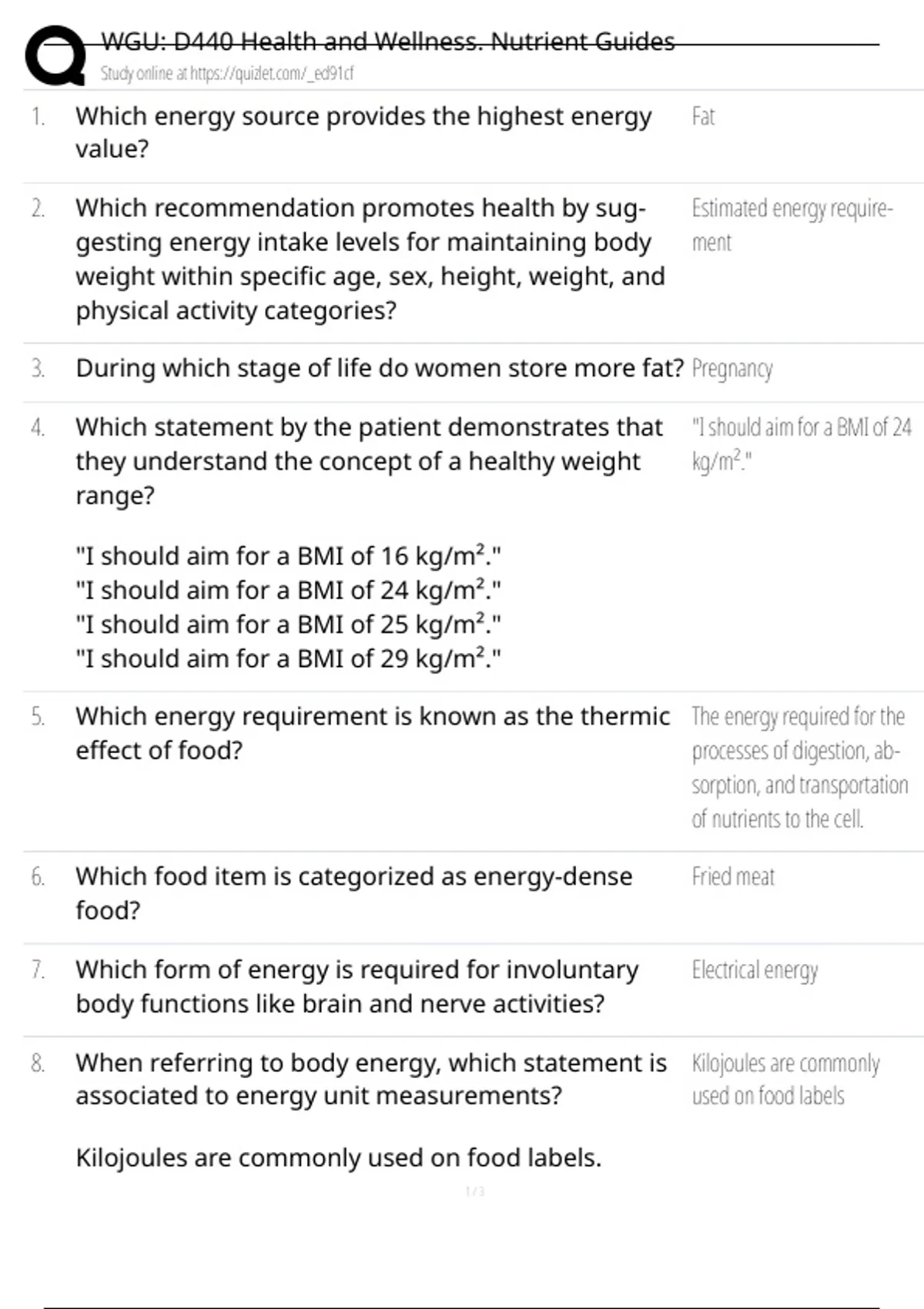 WGU D440 Health and Wellness. Nutrient Guides Exam Q's and A's
