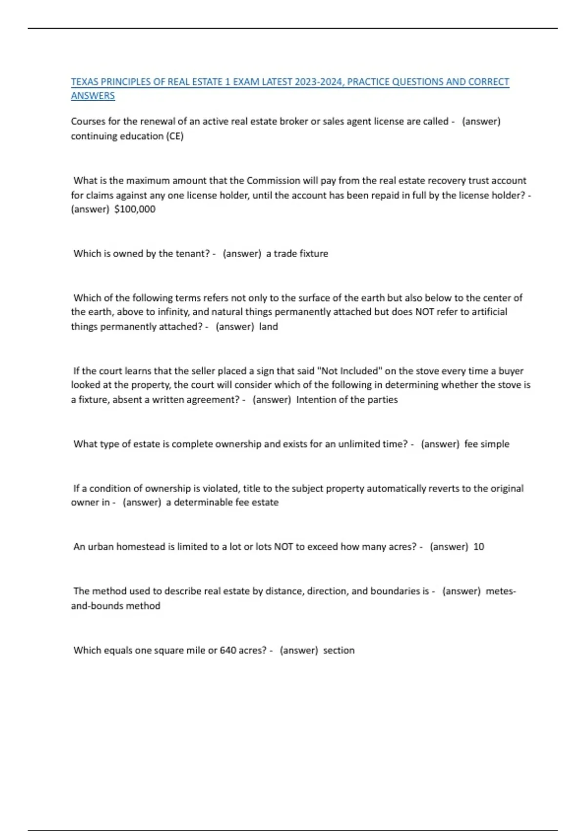 , TEXAS PRINCIPLES OF REAL ESTATE 1 EXAM LATEST 2023-2024, PRACTICE QUESTIONS AND CORRECT