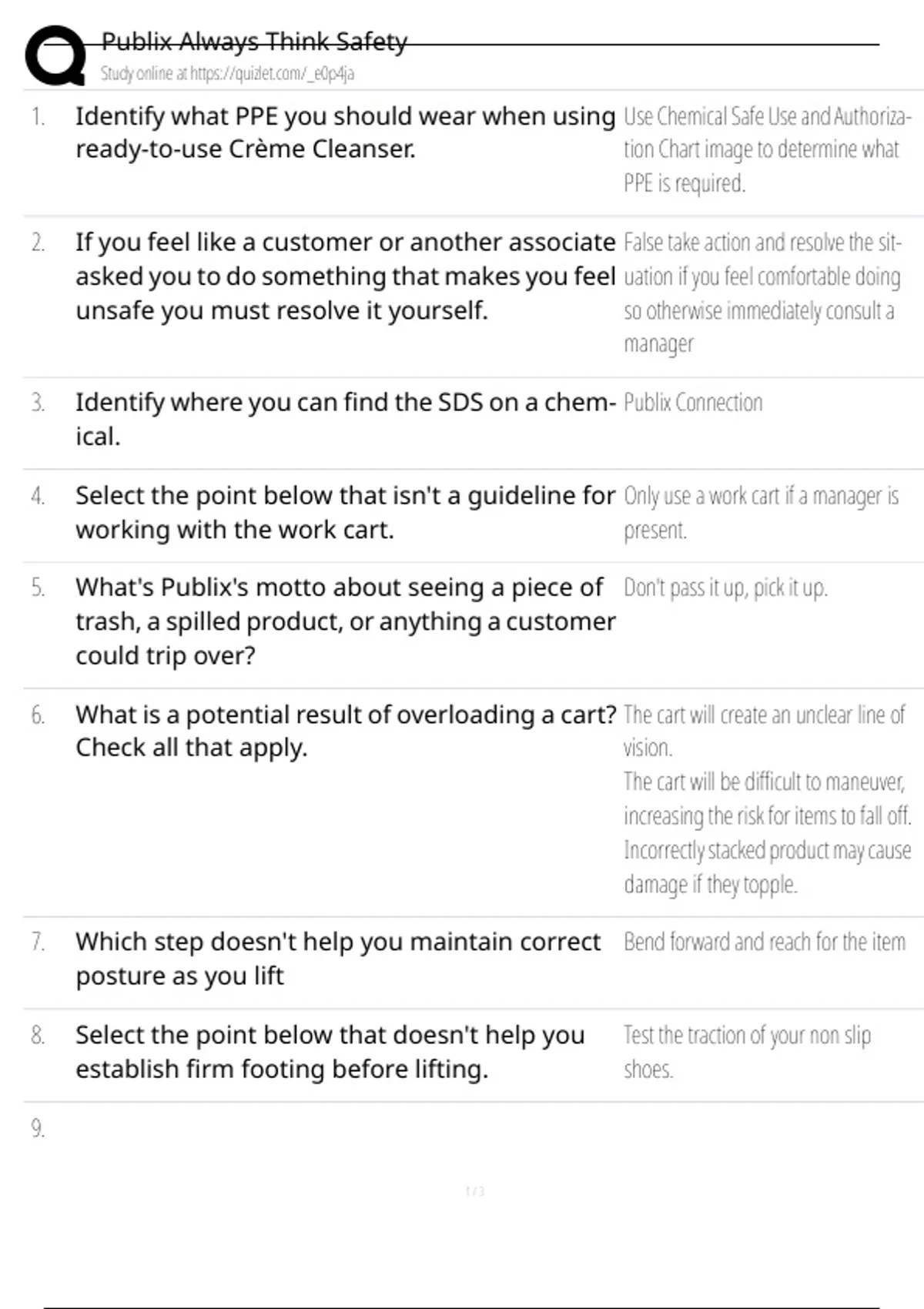 Publix Always Think Safety Exam Q's and A's