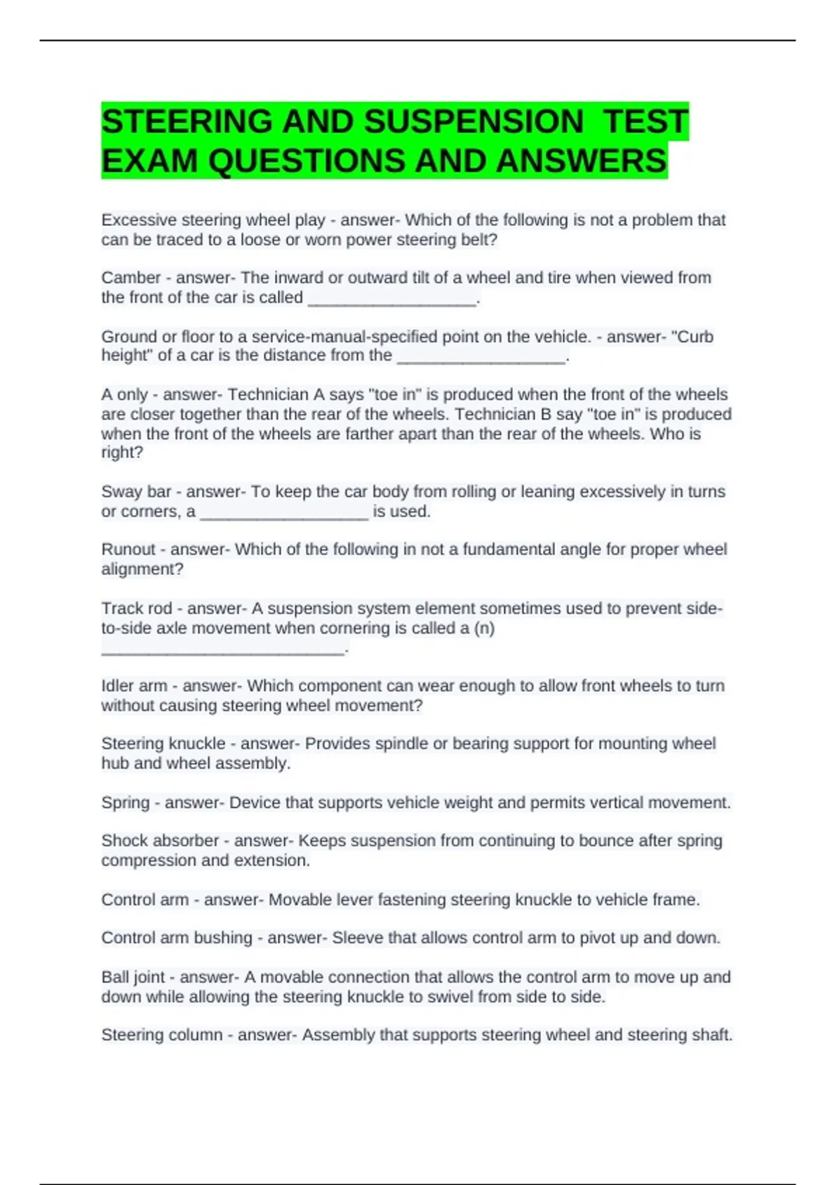 STEERING AND SUSPENSION TEST EXAM QUESTIONS AND ANSWERS Excessive steering wheel play - answer- Which of the following is not a problem that can be traced to a loose or worn power steering belt? Camber - answer- The inward or outward tilt of a wheel and tire when viewed from the front of the car is called __________________. Ground or floor to a service-manual-specified point on the vehicle. - answer- "Curb height" of a car is the distance from the __________________. A only - answer- Technician A says "toe in" is produced when the front of the wheels are closer together than the rear of the wheels. Technician B say "toe in" is produced when the front of the wheels are farther apart than the rear of the wheels. Who is right? Sway bar - answer- To keep the car body from rolling or leaning excessively in turns or corners, a __________________ is used. Runout - answer- Which of the following in not a fundamental angle for proper wheel alignment? Track rod - answer- A suspension system element sometimes used to prevent side-to-side axle movement when cornering is called a (n) __________________________. Idler arm - answer- Which component can wear enough to allow front wheels to turn without causing steering wheel movement? Steering knuckle - answer- Provides spindle or bearing support for mounting wheel hub and wheel assembly. Spring - answer- Device that supports vehicle weight and permits vertical movement. Shock absorber - answer- Keeps suspension from continuing to bounce after spring compression and extension. Control arm - answer- Movable lever fastening steering knuckle to vehicle frame. Control arm bushing - answer- Sleeve that allows control arm to pivot up and down. Ball joint - answer- A movable connection that allows the control arm to move up and down while allowing the steering knuckle to swivel from side to side. Steering column - answer- Assembly that supports steering wheel and steering shaft.