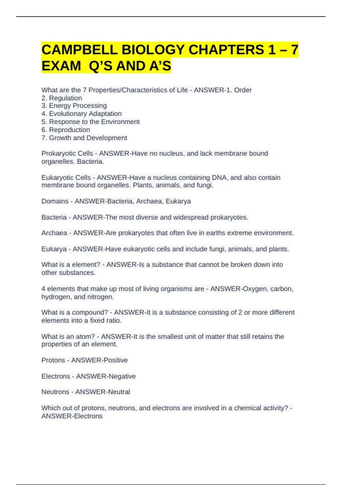 CAMPBELL BIOLOGY CHAPTERS 1 – 7 EXAM Q’S AND A’S What are the 7 Properties/Characteristics of Life - ANSWER-1. Order 2. Regulation 3. Energy Processing 4. Evolutionary Adaptation 5. Response to the Environment 6. Reproduction 7. Growth and Development Prokaryotic Cells - ANSWER-Have no nucleus, and lack membrane bound organelles. Bacteria. Eukaryotic Cells - ANSWER-Have a nucleus containing DNA, and also contain membrane bound organelles. Plants, animals, and fungi. Domains - ANSWER-Bacteria, Archaea, Eukarya Bacteria - ANSWER-The most diverse and widespread prokaryotes. Archaea - ANSWER-Are prokaryotes that often live in earths extreme environment. Eukarya - ANSWER-Have eukaryotic cells and include fungi, animals, and plants. What is a element? - ANSWER-Is a substance that cannot be broken down into other substances. 4 elements that make up most of living organisms are - ANSWER-Oxygen, carbon, hydrogen, and nitrogen. What is a compound? - ANSWER-It is a substance consisting of 2 or more different elements into a fixed ratio. What is an atom? - ANSWER-It is the smallest unit of matter that still retains the properties of an element. Protons - ANSWER-Positive Electrons - ANSWER-Negative Neutrons - ANSWER-Neutral Which out of protons, neutrons, and electrons are involved in a chemical activity? - ANSWER-Electrons