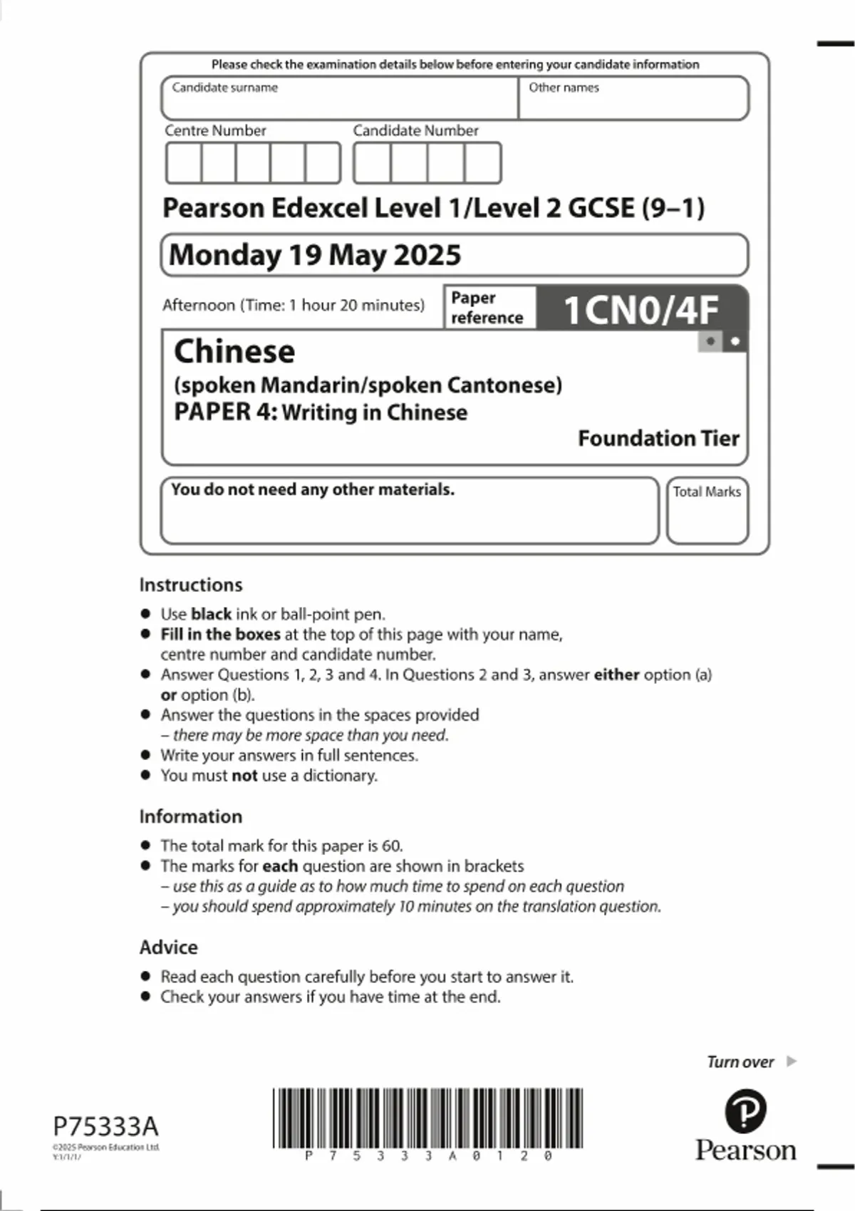 2025 PEARSON EDEXCEL GCSE CHINESE PAPER 4 QUESTION PAPER (1CN0/4F: Foundation tier: Writing in Chinese (spoken Mandarin/spoken Cantonese))