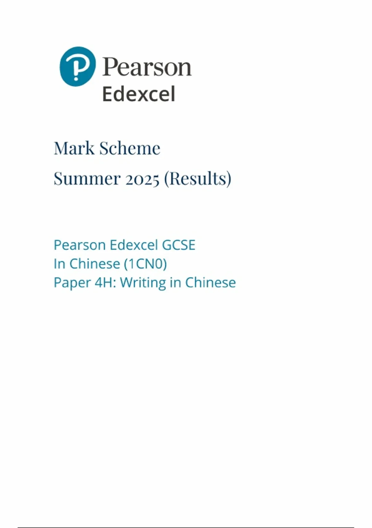 2025 PEARSON EDEXCEL GCSE CHINESE PAPER 4 MARK SCHEME (1CN0/4H: Higher tier: Writing in Chinese (spoken Mandarin/spoken Cantonese))