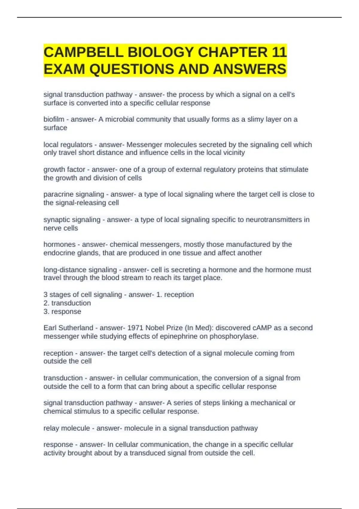 CAMPBELL BIOLOGY CHAPTER 11 EXAM QUESTIONS AND ANSWERS signal transduction pathway - answer- the process by which a signal on a cell's surface is converted into a specific cellular response biofilm - answer- A microbial community that usually forms as a slimy layer on a surface local regulators - answer- Messenger molecules secreted by the signaling cell which only travel short distance and influence cells in the local vicinity growth factor - answer- one of a group of external regulatory proteins that stimulate the growth and division of cells paracrine signaling - answer- a type of local signaling where the target cell is close to the signal-releasing cell synaptic signaling - answer- a type of local signaling specific to neurotransmitters in nerve cells hormones - answer- chemical messengers, mostly those manufactured by the endocrine glands, that are produced in one tissue and affect another long-distance signaling - answer- cell is secreting a hormone and the hormone must travel through the blood stream to reach its target place. 3 stages of cell signaling - answer- 1. reception 2. transduction 3. response Earl Sutherland - answer- 1971 Nobel Prize (In Med): discovered cAMP as a second messenger while studying effects of epinephrine on phosphorylase. reception - answer- the target cell's detection of a signal molecule coming from outside the cell transduction - answer- in cellular communication, the conversion of a signal from outside the cell to a form that can bring about a specific cellular response signal transduction pathway - answer- A series of steps linking a mechanical or chemical stimulus to a specific cellular response. relay molecule - answer- molecule in a signal transduction pathway response - answer- In cellular communication, the change in a specific cellular activity brought about by a transduced signal from outside the cell. ligand - answer- A molecule that binds specifically to a receptor site of another molecule. G-protein coupled receptor - answer- A signal receptor protein in the plasma membrane that responds to the binding of a signaling molecule by activating a G protein. G-protein - answer- A GTP-binding protein that relays signals from a plasma membrane signal receptor, known as a G protein-coupled receptor, to other signal transduction proteins inside the cell.. receptor tyrosine kinases - answer- belong to a major class of plasma membrane receptors characterized by having enzymatic activity - attach phosphates to tyrosine's dimer - answer- a compound whose molecules are composed of two identical monomers ligand-gated ion channel - answer- a type of membrane receptor containing a region that can act as a "gate" when the receptor changes shape intracellular receptor - answer- describes a receptor that binds to its signal inside the cell, must be nonpolar (testosterone acts as transcription factor) protein kinase - answer- An enzyme that transfers phosphate groups from ATP to a protein, thus phosphorylating the protein. protein phosphatase - answer- An enzyme that removes phosphate groups from (dephosphorylates) proteins, often functioning to reverse the effect of a protein kinase. second messenger - answer- A small, nonprotein, water-soluble molecule or ion, such as calcium ion or cyclic AMP, that relays a signal to a cell's interior in response to a signal received by a signal receptor protein. cAMP - answer- is a second messenger important in many biological processes. is derived from adenosine triphosphate (ATP) and used for intracellular signal transduction in many different organisms, conveying the cAMP-dependent pathway. adenylyl cyclase - answer- An enzyme that converts ATP to cyclic AMP in response to a chemical signal. protein kinase A - answer- a serine/threonine kinase which is activated by cAMP (immediate effect) IP3 - answer- inositol triphosphate; binds to ligand-gated channels in the endoplasmic reticulum, opening them and releasing calcium into the cytosol DAG - answer