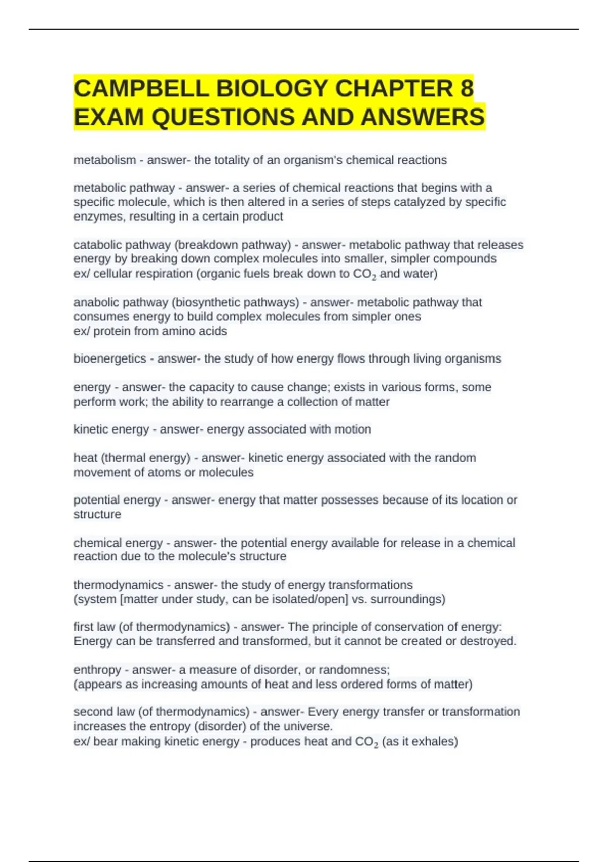 CAMPBELL BIOLOGY CHAPTER 8 EXAM QUESTIONS AND ANSWERS
