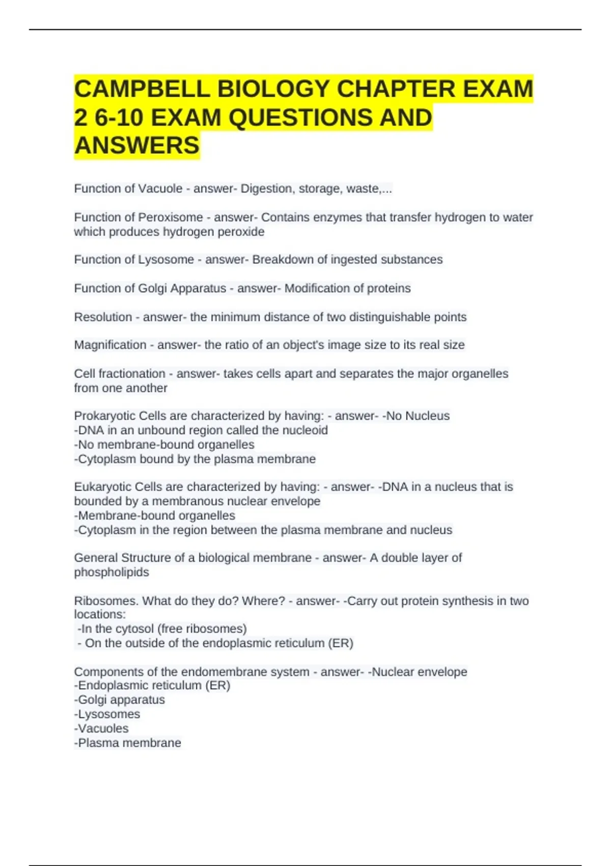 CAMPBELL BIOLOGY CHAPTER EXAM 2 6-10 EXAM QUESTIONS AND ANSWERS Function of Vacuole - answer- Digestion, storage, waste,... Function of Peroxisome - answer- Contains enzymes that transfer hydrogen to water which produces hydrogen peroxide Function of Lysosome - answer- Breakdown of ingested substances Function of Golgi Apparatus - answer- Modification of proteins Resolution - answer- the minimum distance of two distinguishable points Magnification - answer- the ratio of an object's image size to its real size Cell fractionation - answer- takes cells apart and separates the major organelles from one another Prokaryotic Cells are characterized by having: - answer- -No Nucleus -DNA in an unbound region called the nucleoid -No membrane-bound organelles -Cytoplasm bound by the plasma membrane Eukaryotic Cells are characterized by having: - answer- -DNA in a nucleus that is bounded by a membranous nuclear envelope -Membrane-bound organelles -Cytoplasm in the region between the plasma membrane and nucleus General Structure of a biological membrane - answer- A double layer of phospholipids Ribosomes. What do they do? Where? - answer- -Carry out protein synthesis in two locations: -In the cytosol (free ribosomes) - On the outside of the endoplasmic reticulum (ER) Components of the endomembrane system - answer- -Nuclear envelope -Endoplasmic reticulum (ER) -Golgi apparatus -Lysosomes -Vacuoles -Plasma membrane