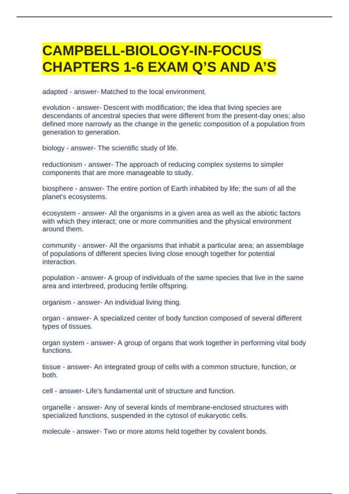 CAMPBELL-BIOLOGY-IN-FOCUS CHAPTERS 1-6 EXAM Q’S AND A’S adapted - answer- Matched to the local environment. evolution - answer- Descent with modification; the idea that living species are descendants of ancestral species that were different from the present-day ones; also defined more narrowly as the change in the genetic composition of a population from generation to generation. biology - answer- The scientific study of life. reductionism - answer- The approach of reducing complex systems to simpler components that are more manageable to study. biosphere - answer- The entire portion of Earth inhabited by life; the sum of all the planet's ecosystems. ecosystem - answer- All the organisms in a given area as well as the abiotic factors with which they interact; one or more communities and the physical environment around them. community - answer- All the organisms that inhabit a particular area; an assemblage of populations of different species living close enough together for potential interaction. population - answer- A group of individuals of the same species that live in the same area and interbreed, producing fertile offspring. organism - answer- An individual living thing. organ - answer- A specialized center of body function composed of several different types of tissues. organ system - answer- A group of organs that work together in performing vital body functions. tissue - answer- An integrated group of cells with a common structure, function, or both. cell - answer- Life's fundamental unit of structure and function. organelle - answer- Any of several kinds of membrane-enclosed structures with specialized functions, suspended in the cytosol of eukaryotic cells. molecule - answer- Two or more atoms held together by covalent bonds. atom - answer- The smallest unit of matter that retains the properties of an element. emergent properties - answer- New properties that arise with each step upward in the hierarchy of life, owing to the arrangement and interactions of parts as complexity increases. systems biology - answer- An approach to studying biology that aims to model the dynamic behavior of whole biological systems based on a study of the interactions among the system's parts. eukaryotic cell - answer- A type of cell with a membrane-enclosed nucleus and membrane-enclosed organelles and include protists, plants, fungi, and animals. prokaryotic cell - answer- A type of cell lacking a membrane-enclosed nucleus and membrane-enclosed organelles and include bacteria and archaea. DNA - answer- A nucleic acid molecule, usually a double-helix, in which each polynucleotide strand consists of nucleotide monomers with a deoxyribose sugar and the nitrogenous bases adenine (A), cytosine (C), guanine (G), and thymine (T); capable of being replicated and determining the inherited structure of a cell's proteins. replication - answer- The process of copying DNA before a cell divides. gene - answer- A discrete unit of hereditary information consisting of a specific nucleotide sequence in DNA (or RNA, in some viruses). gene expression - answer- The process by which information encoded in DNA directs the synthesis of proteins or, in some cases, RNAs that are not translated into proteins and instead function as RNAs. genome - answer- The genetic material of an organism or virus; the complete complement of an organism's or virus's genes along with its noncoding nucleic acid sequences. genomics - answer- The study of whole sets of genes and their interactions within a species, as well as genome comparisons between species. bioinformatics - answer- The use of computers, software, and mathematical models to process and integrate biological information from large data sets. Bacteria - answer- One of two prokaryotic domains, the other being Archaea. Archaea - answer- One of two prokaryotic domains, the other being Bacteria. Eukarya - answer- The domain that includes all eukaryotic organisms. natural selection - answer- A process in which individuals that have certain inherited traits tend to survive and reproduce at higher rates than other individuals because of those traits. science - answer- An approach to understanding the natural world. inquiry - answer- The search for information and explanation, often focusing on specific questions. data - answer- Recorded observations. qualitative data - answer- A type of recorded observation that is descriptive and not numerical. quantitative data - answer- A type of recorded observation that is numerical and often organized into tables and graphs. inductive reasoning - answer- A type of logic in which generalizations are based on a large number of specific observations. hypothesis - answer- A testable explanation for a set of observatio