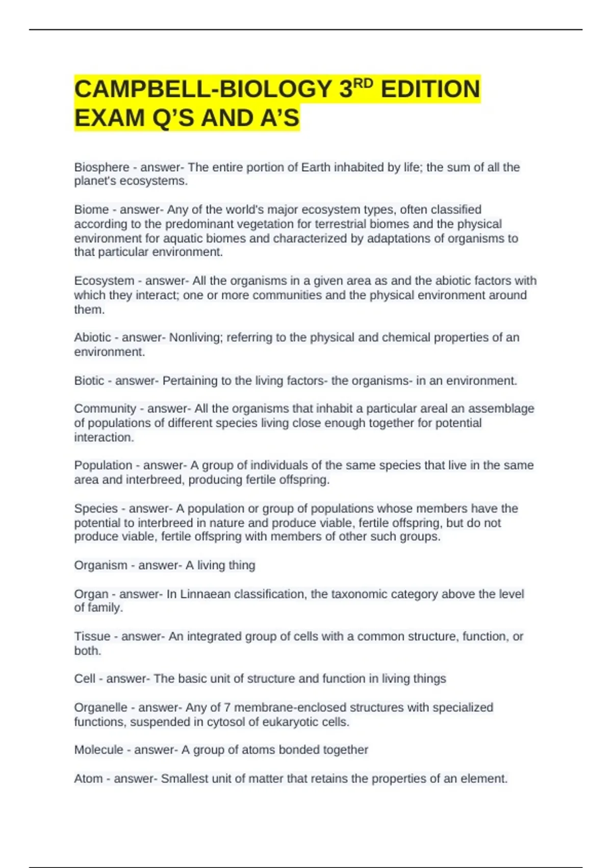 CAMPBELL-BIOLOGY 3RD EDITION EXAM Q’S AND A’S Biosphere - answer- The entire portion of Earth inhabited by life; the sum of all the planet's ecosystems. Biome - answer- Any of the world's major ecosystem types, often classified according to the predominant vegetation for terrestrial biomes and the physical environment for aquatic biomes and characterized by adaptations of organisms to that particular environment. Ecosystem - answer- All the organisms in a given area as and the abiotic factors with which they interact; one or more communities and the physical environment around them. Abiotic - answer- Nonliving; referring to the physical and chemical properties of an environment. Biotic - answer- Pertaining to the living factors- the organisms- in an environment. Community - answer- All the organisms that inhabit a particular areal an assemblage of populations of different species living close enough together for potential interaction. Population - answer- A group of individuals of the same species that live in the same area and interbreed, producing fertile offspring. Species - answer- A population or group of populations whose members have the potential to interbreed in nature and produce viable, fertile offspring, but do not produce viable, fertile offspring with members of other such groups. Organism - answer- A living thing Organ - answer- In Linnaean classification, the taxonomic category above the level of family. Tissue - answer- An integrated group of cells with a common structure, function, or both. Cell - answer- The basic unit of structure and function in living things Organelle - answer- Any of 7 membrane-enclosed structures with specialized functions, suspended in cytosol of eukaryotic cells. Molecule - answer- A group of atoms bonded together Atom - answer- Smallest unit of matter that retains the properties of an element. Cell theory - answer- idea that all living things are composed of cells, cells are the basic units of structure and function in living things, and new cells are produced from existing cells Prokaryotic cell - answer- A type of cell lacking a membrane-enclosed nucleus and membrane-enclosed organelles. Organisms with this cell = Bacteria and archaea. Eukaryotic cell - answer- A type of cell with a membrane-enclosed nucleus and membrane-enclosed organelles. Organisms with this cell = protists, plants, fungi, and animals. Multicellular - answer- Consisting of many cells Unicellular - answer- Made of a single cell Colonial - answer- A cluster of identical cells (clones) on the surface of (or within) a solid medium, usually derived from a single parent cell, as in bacterial colony. Cell (plasma) membrane - answer- phospholipid bilayer that protects and encloses the cell; controls transport; maintains homeostasis Cytoplasm - answer- The contents of the cell bounded by the plasma membrane; in eukaryotes, the portion exclusive of the nucleus. DNA - answer- A double-stranded, helical nucleic acid molecule, consisting of nucleotide monomers with a deoxyribose sugar and the nitrogenous bases adenine (A), cytosine (C), guanine (G), and thymine (T); capable of being replicated and determining the inherited structure of a cell's proteins. Ribosome - answer- A complex of rRNA and protein molecules that functions as a site of protein synthesis in the cytoplasm; consists of a large and a small subunit. In eukaryotic cells, each subunit is assembled in the nucleolus. Cell wall - answer- A protective layer external to the plasma membrane in the cells of plants, prokaryotes, fungi, and some protists. Polysaccharides such as cellulose (in plants and some protists), chitin (in fungi), and peptidoglycan (in bacteria) are important structural components of cell walls. Nucleus - answer- 1) an atom's central core, containing protons and neutrons. 2)the organelle of a eukaryotic cell that contains the genetic material in the form of chromosomes, made up of chromatin. 3) a cluster of neurons. Endoplasmic reticulum (ER) - answer- An extensive membranous network in eukaryotic cells, continuous with the outer nuclear membrane and composed of ribosome-studded (rough) and ribosome free (smooth) regions. Golgi apparatus - answer- An organelle in eukaryotic cells consisting of stacks of flat membranous sacs that modify, store, and route products of the endoplasmic reticulum and synthesize some products, notably noncellulose carbohydrates.